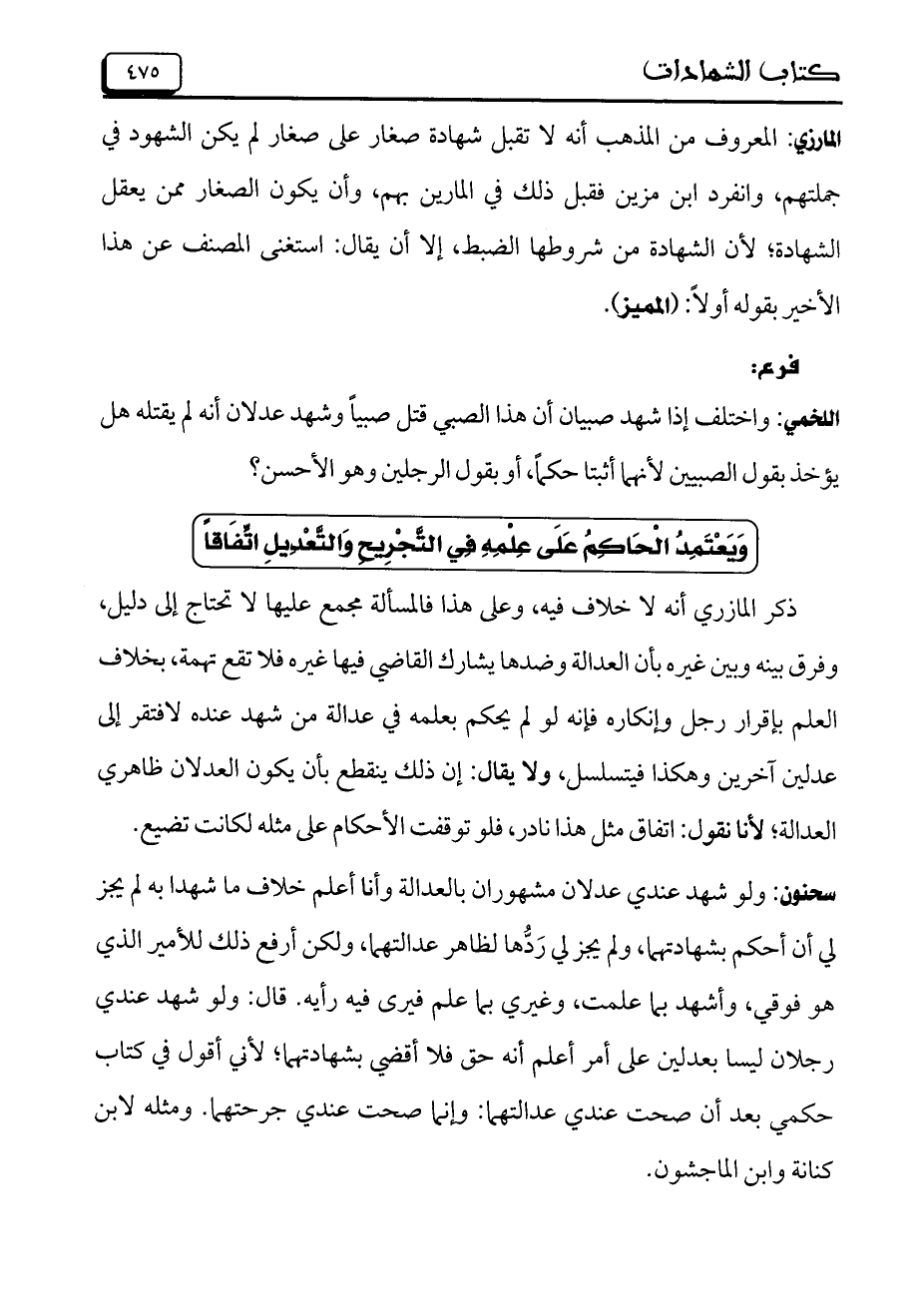 سحنون: ولو شهد عندي عدلان مشهوران بالعدالة وأنا أعلم خلاف ما شهدا به لم يجز لي أن أحكم بشهادتهما، ولم يجز لي ردها لظاهر عدالتهما، ولكن أرفع ذلك للأمير الذي هو فوقي، وأشهد بما علمت، وغيري بما علم فيرى فيه رأيه. قال: ولو شهد عندي رجلان ليسا بعدلين على أمر أعلم أنه حق فلا أقضي بشهادتهما؛ لأني أقول في كتاب حكمي بعد أن صحت عندي عدالتهما: وإنما صحت عندي جرحتهما. ومثله لابن كنانة وابن الماجشون.