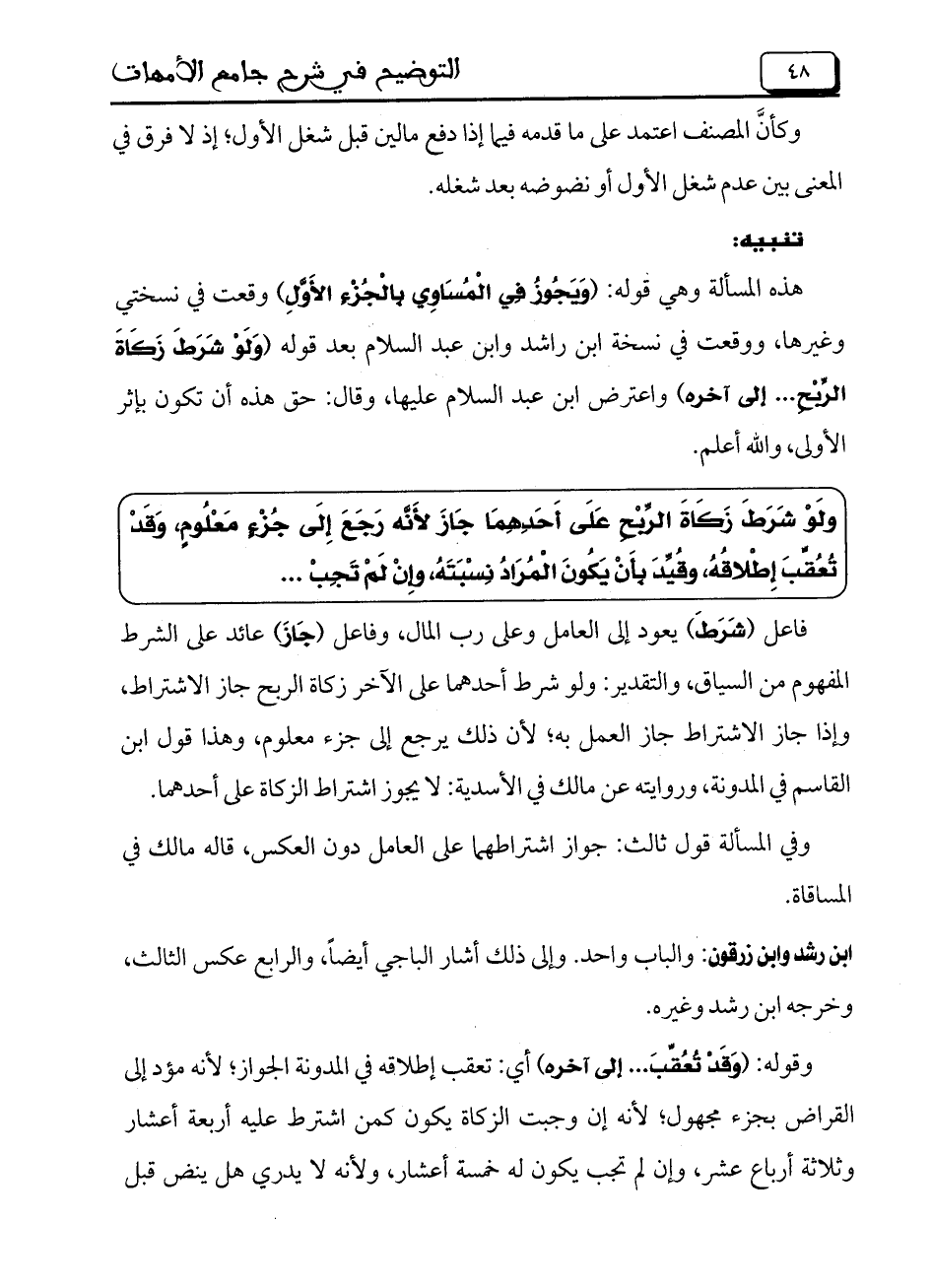 هذه المسألة وهي قوله: (ويَجُوزُ فِي الْمُسَاوِي بِجُزْءٍ الأَوَّلِ) وقعت في نسختي وغيرها، ووقعت في نسخة ابن راشد وابن عبد السلام بعد قوله (وَلَوْ شَرَطَ زَكَاةَ الرِّبْحِ .. إلى آخره) واعترض ابن عبد السلام عليها، وقال: حق هذه أن تكون بإثر الأولى، والله أعلم.