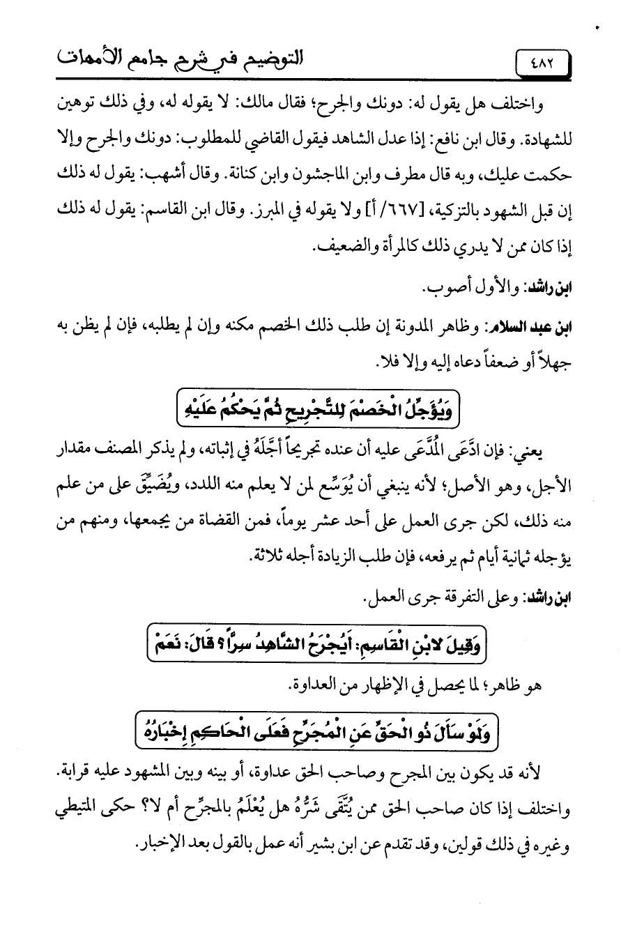 وَيُؤَجِّلُ الْخَصْمَ لِلتَّجْرِيحِ ثُمَّ يَحْكُمُ عَلَيْهِ
