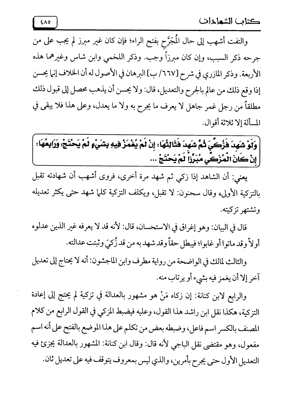 والرابع لابن كنانة: إن زكاه من هو مشهور بالعدالة في تزكية لم يحتج إلى إعادة التزكية، هكذا نقل ابن راشد هذا القول، وعليه فيضبط المزكي في القول الرابعمن كلام المصنف بالكسر اسم فاعل، وضبطه بعض من تكلم على هذا الموضع بالفتح على أنه اسم مفعول، وهو مقتضى نقل الباجي لأنه قال: وقال ابن كنانة: المشهور بالعدالة يجزئ فيه التعديل الأول حتى يجرح بأمرين، والذي ليس بمعروف يتوقف فيه على تعديل ثان.