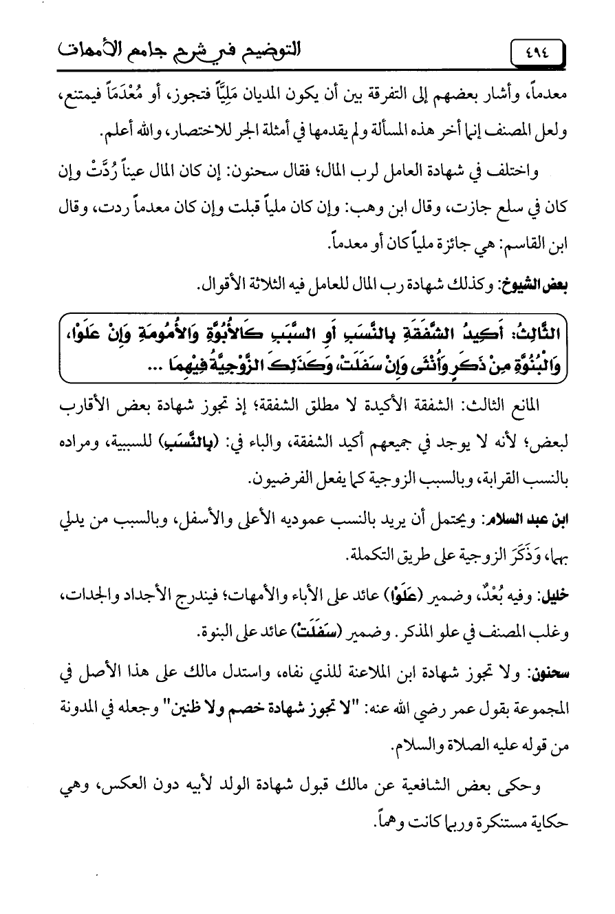 المانع الثالث: الشفقة الأكيدة لا مطلق الشفقة؛ إذ تجوز شهادة بعض الأقارب لبعض؛ لأنه لا يوجد في جميعهم أكيد الشفقة، والباء في: (بِالنَّسَبِ) للسببية، ومراده بالنسب القرابة، وبالسبب الزوجية كما يفعل الفرضيون.
