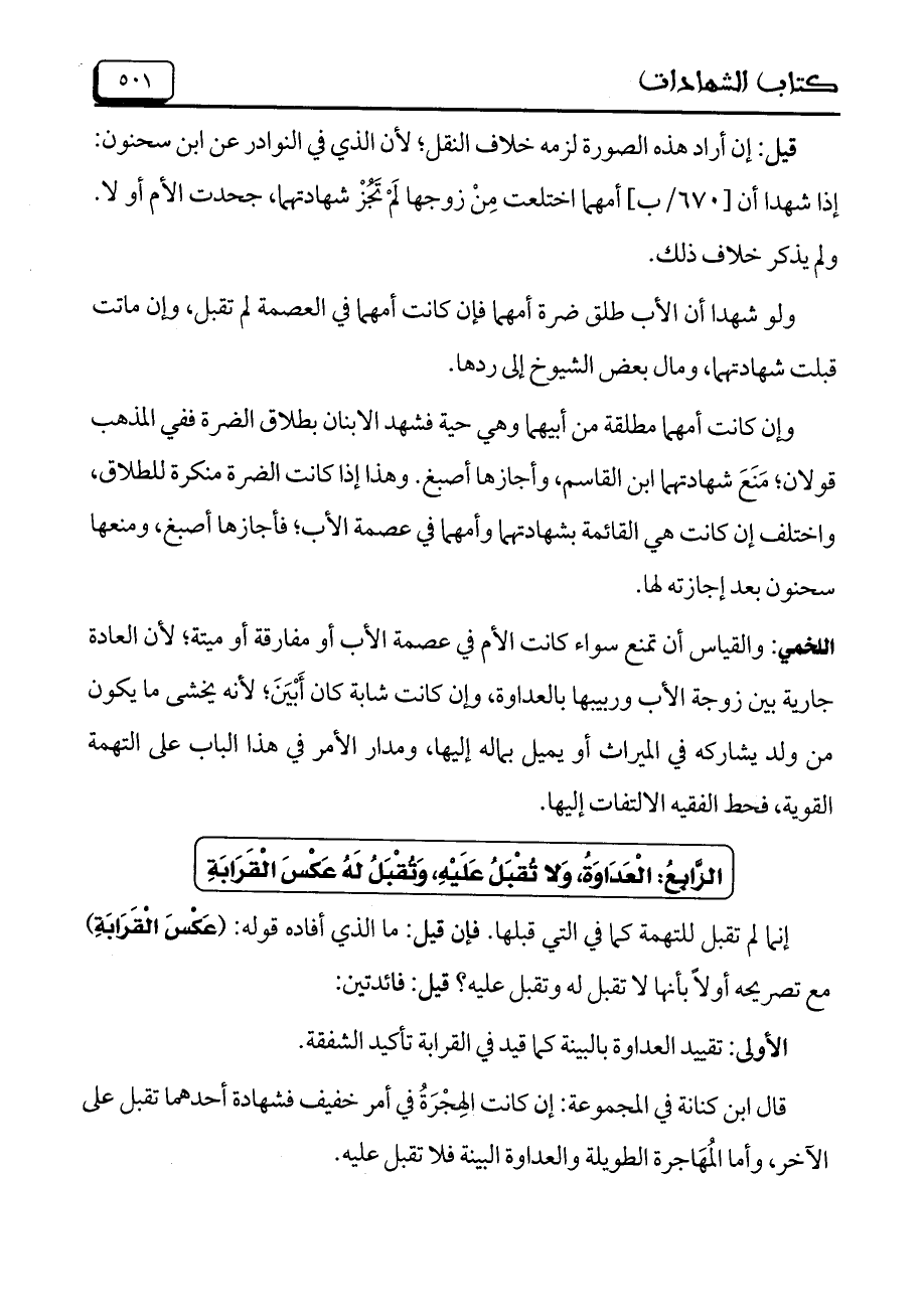 الرَّابِعُ: الْعَدَاوَةُ، وَلا تُقْبَلُ عَلَيْهِ، وَتُقْبَلُ لَهُ عَكْسَ الْقَرَابَةِ