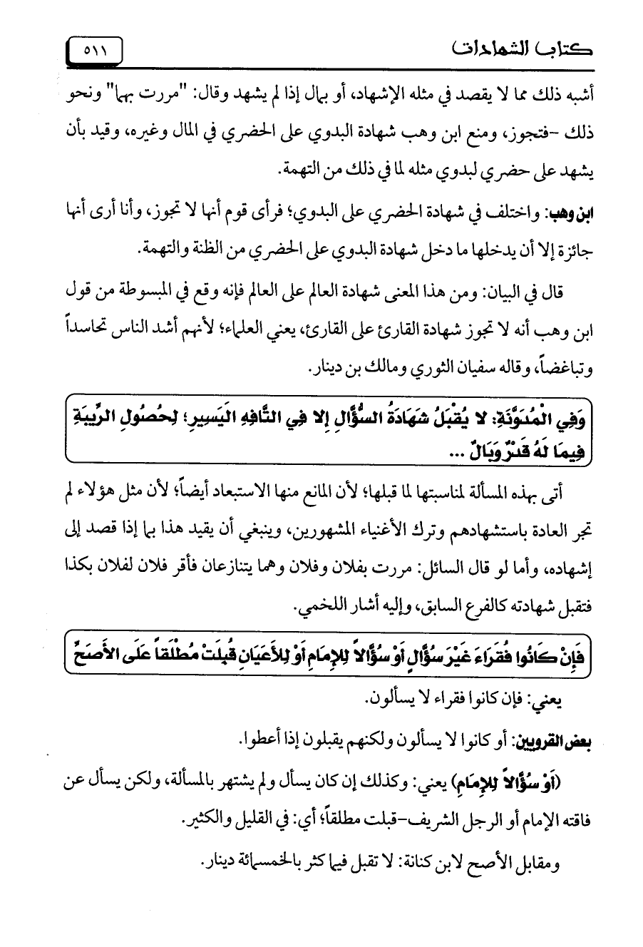 ابن وهب: واختلف في شهادة الحضري على البدوي؛ فرأى قوم أنها لا تجوز، وأنا أرى أنها جائزة إلا أن يدخلها ما دخل شهادة البدوي على الحضري من الظنة والتهمة.