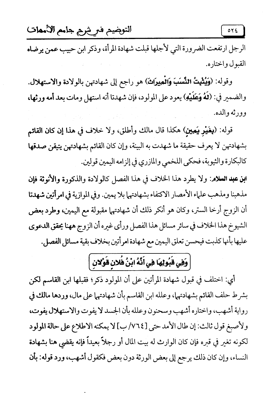 ابن عبد السلام: ولا يطرد هذا الخلاف في هذا الفصل كالولادة والذكورة والأنوثة فإن مذهبنا ومذهب علماء الأمصار الاكتفاء بشهادتهما بلا يمين. وفي الموازية في امرأتين شهدتا أن الزوج أرخا الستر، وكان هو أنكر ذلك أن شهادتهما مقبولة مع اليمين، وطرجد بعض الشيوخ هذا الخلاف في سائر مسائل هذا الفصل ورأى غيره أن الزوج ههنا يحقق الدعوى عليها بأنها كذبت فيحسن تعلق اليمين مع شهادة امرأتين بخلاف بقية مسائل الفصل.