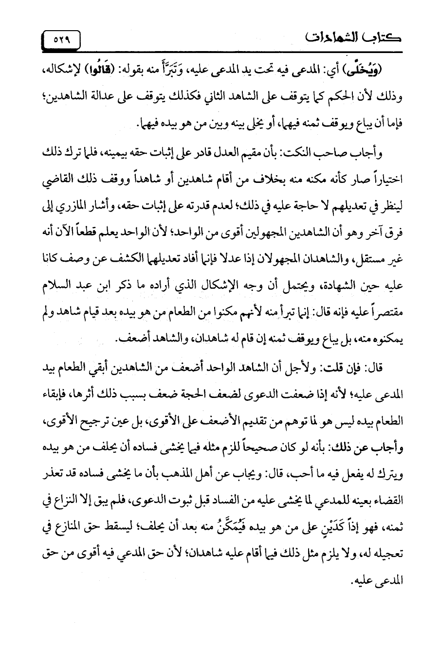 قال: فإن قلت: ولأجل أن الشاهد الواحد أضعف من الشاهدين أبقي الطعام بيد المدعي عليه؛ لأنه إذا ضعفت الدعوى لضعف الحجة ضعف بسبب ذلك أثرها، فإبقاء الطعام بيده ليس هو لما توهم من تقديم الأضعف على الأقوى، بل عين ترجيح الأقوى، وأجاب عن ذلك: بأنه لو كان صحيحاً للزم مثله فيما يخشى فساده أن يحلف من هو بيده ويترك له يفعل فيه ما أحب، قال: ويجاب عن أهل المذهب بأن ما يخشى فساده قد تعذر القضاء بعينه للمدعي لما يخشى عليه من الفساد قبل ثبوت الدعوى، فلم يبق إلا النزاع في ثمنه، فهو إذا كدين على من هو بيده فيمكن منه بعد أن يحلف؛ ليسقط حق المنازع في تعجيله له، ولا يلزم مثل ذلك فيما أقام عليه شاهدان؛ لأن حق المدعي فيه أقوى من حق المدعى عليه.