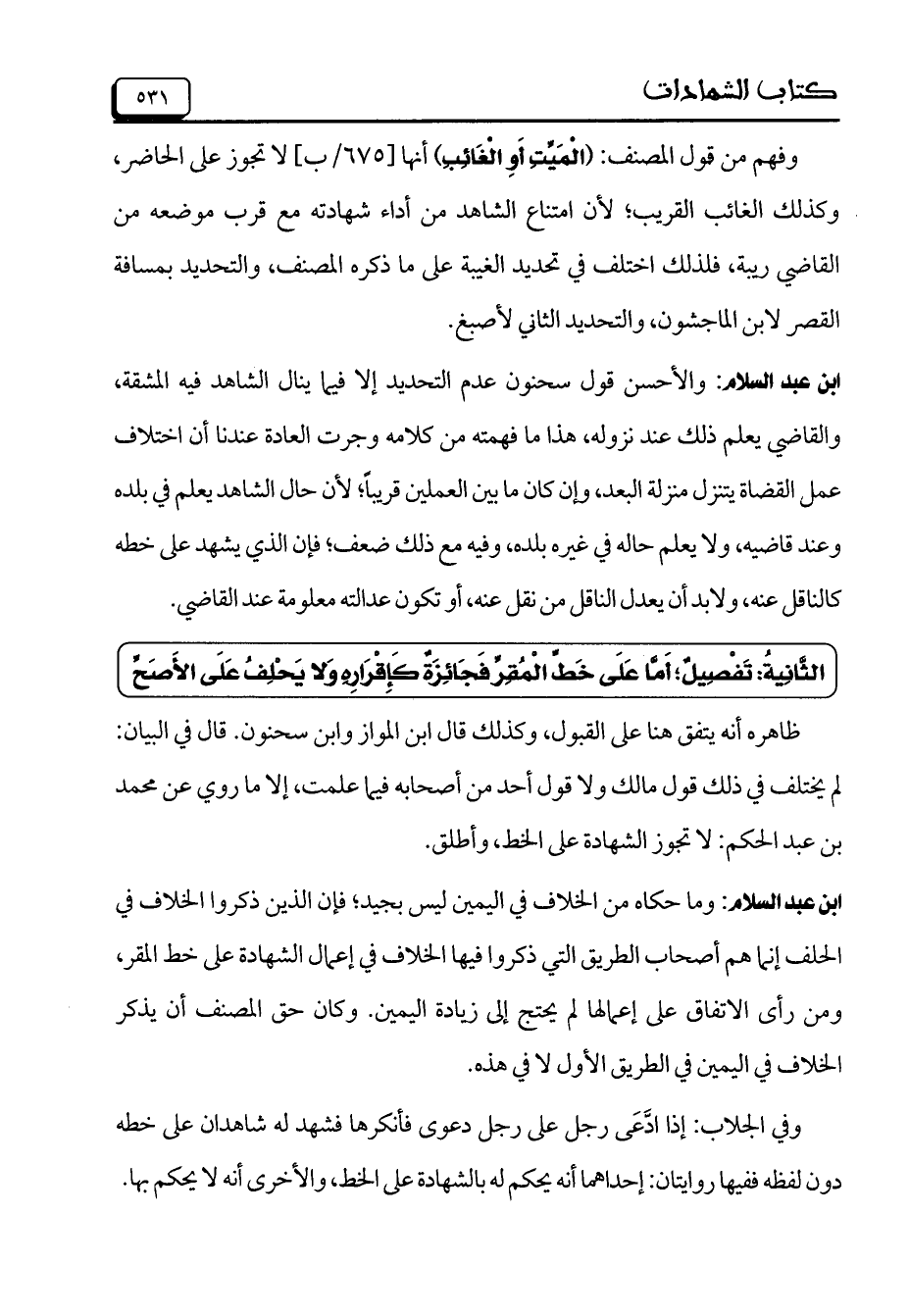 ابن عبد السلام: والأحسن قول سحنون عدم التحديد إلا فيما ينال الشاهد فيه المشقة، والقاضي يعلم ذلك عند نزوله، هذا ما فهمته من كلامه وجرت العادة عندنا أن اختلاف عمل القضاة يتنزل منزلة البعد، وإن كان ما بين العملين قريباً؛ لأن حال الشاهد يعلم في بلده وعند قاضيه، ولا يعلم حاله في غير بلده، وفيه مع ذلك ضعف؛ فإن الذي يشهد على خطه كالناقل عنه، ولابد أن يعدل الناقل من نقل عنه، أو تكون عدالته معلومة عند القاضي.
