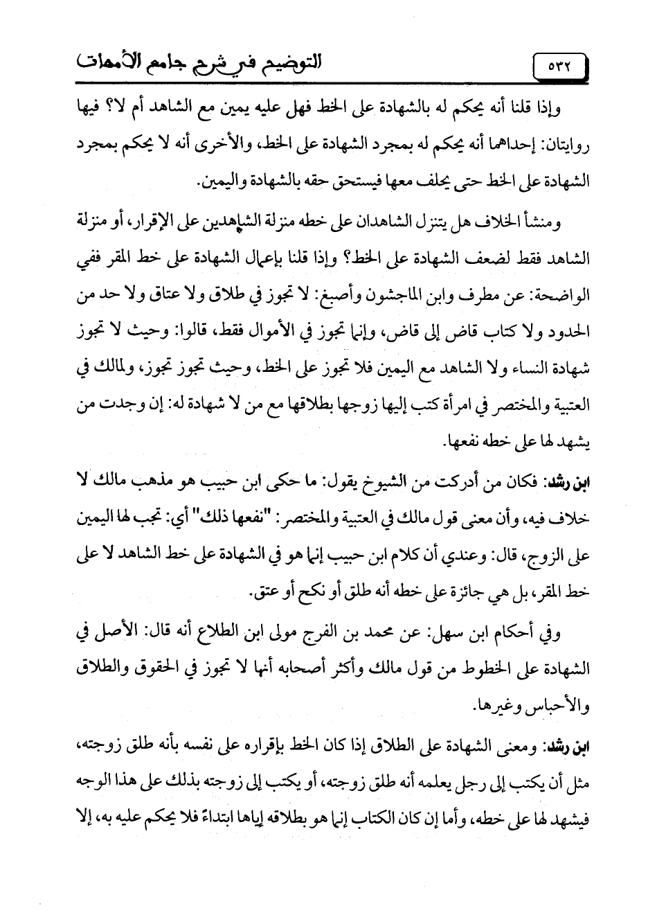 ابن رشد: فكان من أدركت من الشيوخ يقول: ما حكى ابن حبيب هو مذهب مالك لا خلاف فيه، وأن معنى قول مالك في العتبية والمختصر: "نفعها ذلك" أي: تجب لها اليمين على الزوج، قال: وعندي أن كلام ابن حبيب إنما هو في الشهادة على خط الشاهد لا على خط المقر، بل هي جائزة على خطه أنه طلق أو نكح أو عتق.