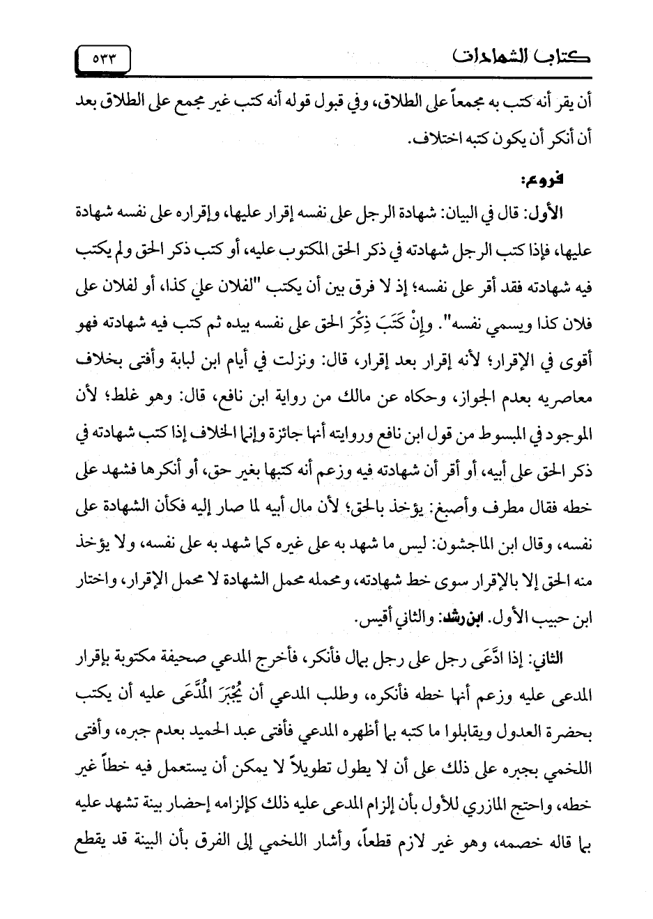 الأول: قال في البيان: شهادة الرجل على نفسه إقرار عليها، وإقراره على نفسه شهادة عليها، فإذا كتب الرجل شهادته في ذكر الحق المكتوب عليه، أو كتب ذكر الحق ولم يكتب فيه شهادته فقد أقر على نفسه؛ إذ لا فرق بين أن يكتب "لفلان علي كذا، أو لفلان على فلان كذا ويسمي نفسه". وإن كتب ذكر الحق على نفسه بيده ثم كتب فيه شهادته فهو أقوى في الإقرار؛ لأنه إقرار بعد إقرار، قال: ونزلت في أيام ابن لبابة وأفتى بخلاف معاصريه بعدم الجواز، وحكاه عن مالك من رواية ابن نافع، قال: وهو غلط؛ لأن الموجود في المبسوط من قول ابن نافع وروايته أنها جائزة وإنما الخلاف إذا كتب شهادته في ذكر الحق على أبيه، أو أقر أن شهادته فيه وزعم أنه كتبها بغير حق، أو أنكرها فشهد على خطه فقال مطرف وأصبغ: يؤخذ بالحق؛ لأن مال أبيه لما صار إليه فكأن الشهادة على نفسه، وقال ابن الماجشون: ليس ما شهد به على غيره كما شهد به على نفسه، ولا يؤخذ منه الحق إلا بالإقرار سوى خط شهادته، ومحمله محمل الشهادة لا محمل الإقرار، واختار ابن حبيب الأول. ابن رشد: والثاني أقيس.
