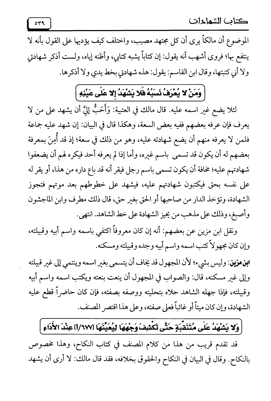 ابن مزين: وليس بشيء؛ لأن المجهول قد يخاف أن يتسمى بغير اسمه وينتمي إلى غير قبيلته وإلى غير مسكنه، قال: والصواب في المجهول أن ينعت بنعته ويكتب اسمه واسم أبيه وقبيلته، فإذا جهله الشاهد حلاه بتحليته ووصفه بصفته، فإن كان حاضراً قطع عليه الشهادة، وإن كان ميتاً أو غائباً فعلى صفته، وعلى هذا اقتصر المصنف.