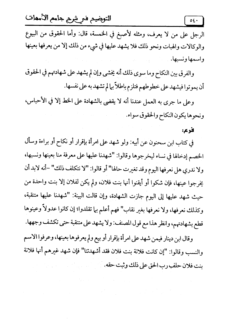 وقال ابن دينار فيمن شهد على امرأة بإقرار أو بيع ولم يعرفوها بعينها، وعرفوا الاسم والنسب وقالوا: "إن كانت فلانة بنت فلان فقد أشهدتنا" فإن شهد غيرهم أنها فلانة بنت فلان حلف رب الحق على ذلك وثبت حقه.