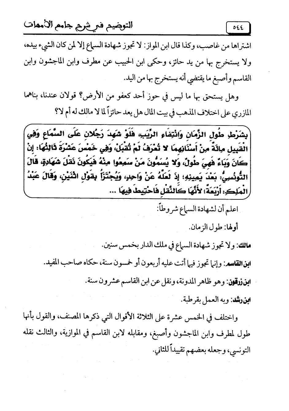 بِشَرْطِ طُولِ الزَّمَانِ وَانْتِفَاءِ الرِّيَبِ، فَلَوْ شَهِدَ رَجُلانِ عَلَى السَّمَاعِ وَفِي الْقَبِيلِ مِائَةُ مِنْ أَسْنَانِهِمَا لا تُعْرَفُ لَمْ تُقْبَلْ، وَفِي خَمْسَ عَشْرَةَ ثَالِثُهَا: إِنْ كَانَ وَبَاءُ فَهِيَ طُولُ، وَلا يُسَمُّونَ مَنْ سَمِعُوا مِنْهُ فَيَكُونَ نَقْلَ شَهَادِةٍ، قَالَ التُّونُسِيُّ: بَعْدَ يَمِينِهِ؛ إِذَ لَعَلُّهُ عَنْ وَاحِدٍ، وَيُجْتَزَأُ بِقَوْلِ اثْنَيْنِ، وَقَالَ عَبْدُ الْمَلِكِ: أَرْبَعَةُ؛ لأَنَّهَا كَالنَّقْلِ فَاحْتِيطَ فِيهَا ..