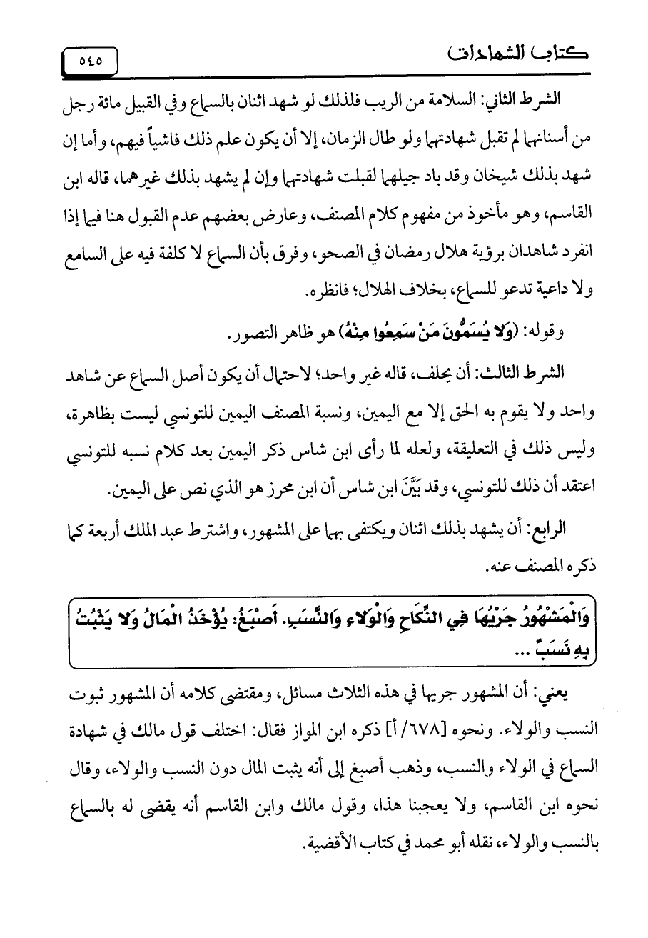الشرط الثاني: السلامة من الريب فلذلك لو شهد اثنان بالسماع وفي القبيل مائة رجل من أسنانهما لم تقبل شهادتهما ولو طال الزمان، إلا أن يكون علم ذلك فاشياً فيهم، وأما إن شهد بذلك شيخان وقد باد جيلهما لقبلت شهادتهما وإن لم يشهد بذلك غيرهما، قاله ابن القاسم، وهو مأخوذ من مفهوم كلام المصنف، وعارض بعضهم عدم القبول هنا فيما إذا انفرد شاهدان برؤية هلال رمضان في الصحو، وفرق بأن السماع لا كلفة فيه على السامع ولا داعية تدعو للسماع، بخلاف الهلال؛ فانظره.