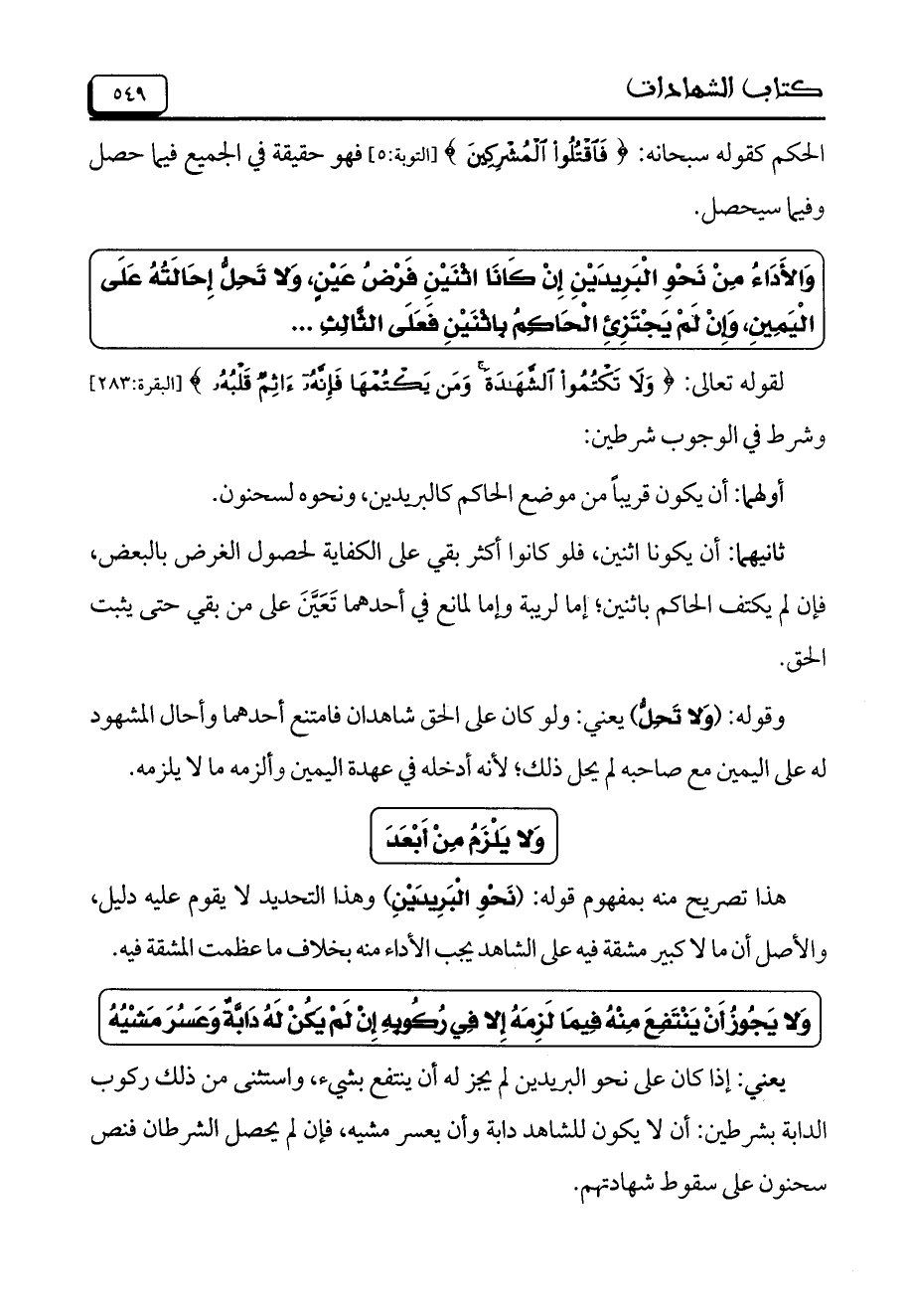 هذا تصريح منه بمفهوم قوله: (نَحْوِ الْبَرِيدَيْنِ) وهذا التحديد لا يقوم عليه دليل، والأصل أن ما لا كبير مشقة فيه على الشاهد يجب الأداء منه بخلاف ما عظمت المشقة فيه.