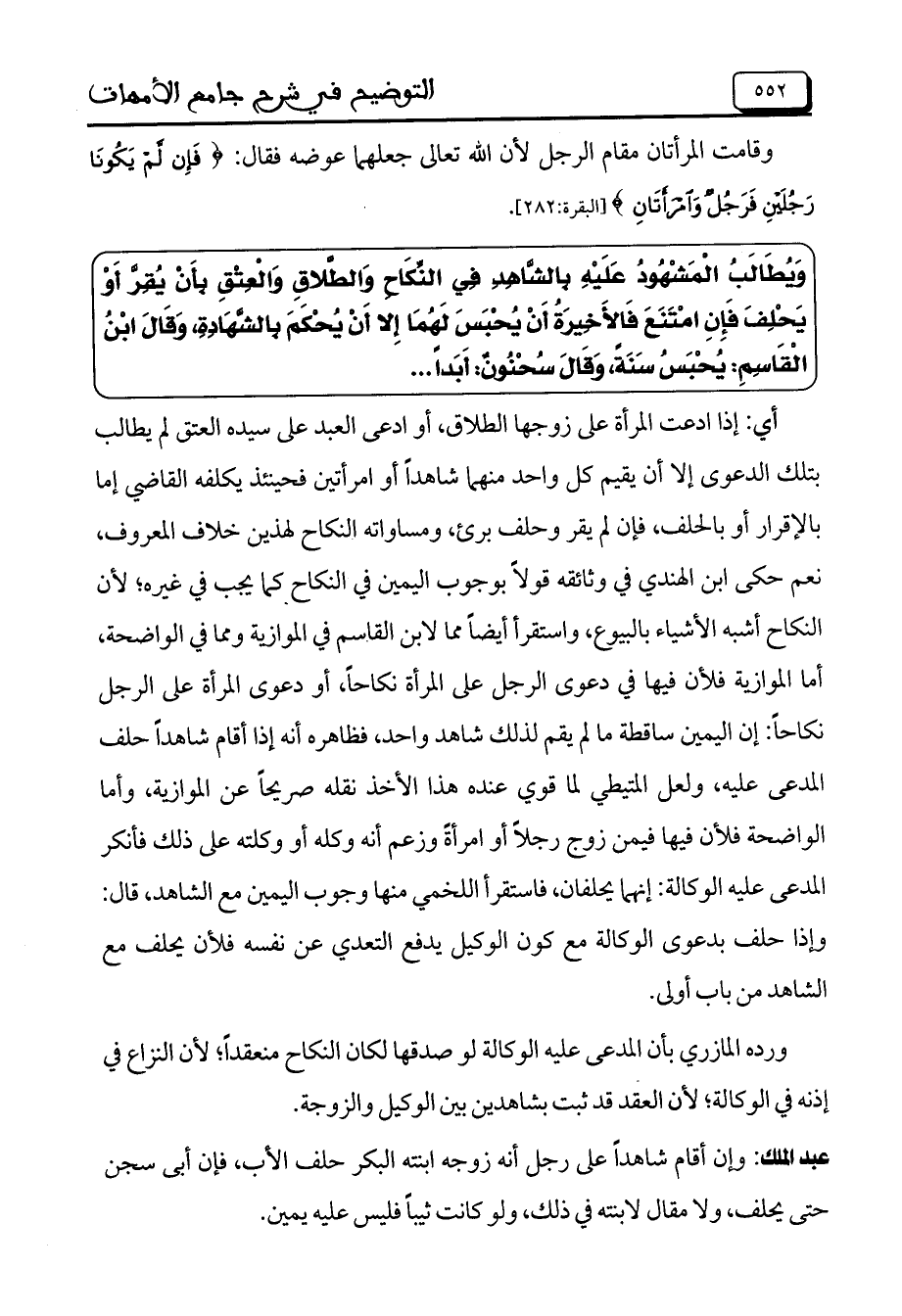 وَيُطَالَبُ الْمَشْهُودُ عَلَيْهِ بِالشَّاهِدِ فِي النِّكَاحِ وَالطَّلاقِ وَالْعِتْقِ بِأَنْ يُقِرَّ أَوْ يَحْلِفَ فَإِنِ امْتَنَعَ فَالأَخِيرَةُ أَنْ يُحْبَسَ لَهُمَا إِلا أَنْ يُحْكَمَ بِالشَّهَادِةِ، وَقَالَ ابن القاسم: يُحْبَسُ سَنَةً، وَقَالَ سحنون: أَبَداً ..