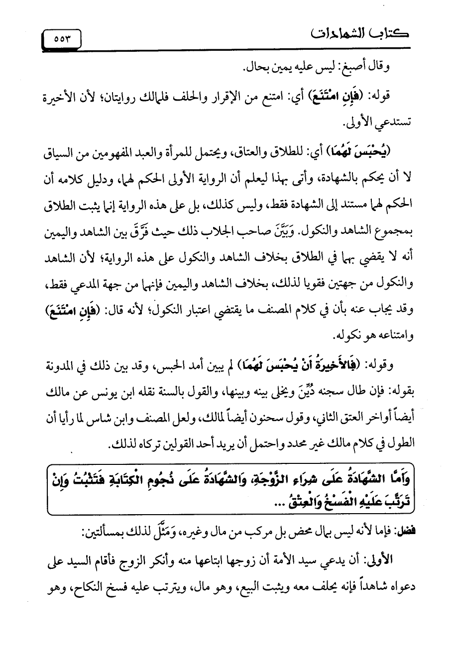 (يُحْبَسَ لَهُمَا) أي: للطلاق والعتاق، ويحتمل للمرأة والعبد المفهومين من السياق لا أن يحكم بالشهادة، وأتى بهذا ليعلم أن الرواية الأولى الحكم لهما، ودليل كلامه أن الحكم لهما مستند إلى الشهادة فقط، وليس كذلك، بل على هذه الرواية إنما يثبت الطلاق بمجموع الشاهد والنكول. وبين صاحب الجلاب ذلك حيث فرق بين الشاهد واليمين أنه لا يقضي بهما في الطلاق بخلاف الشاهد والنكول على هذه الرواية؛ لأن الشاهد والنكول من جهتين فقويا لذلك، بخلاف الشاهد واليمين فإنهما من جهة المدعي فقط، وقد يجاب عنه بأن في كلام المصنف ما يقتضي اعتبار النكول؛ لأنه قال: (فَإِنِ امْتَنَعَ) وامتناعه هو نكوله.