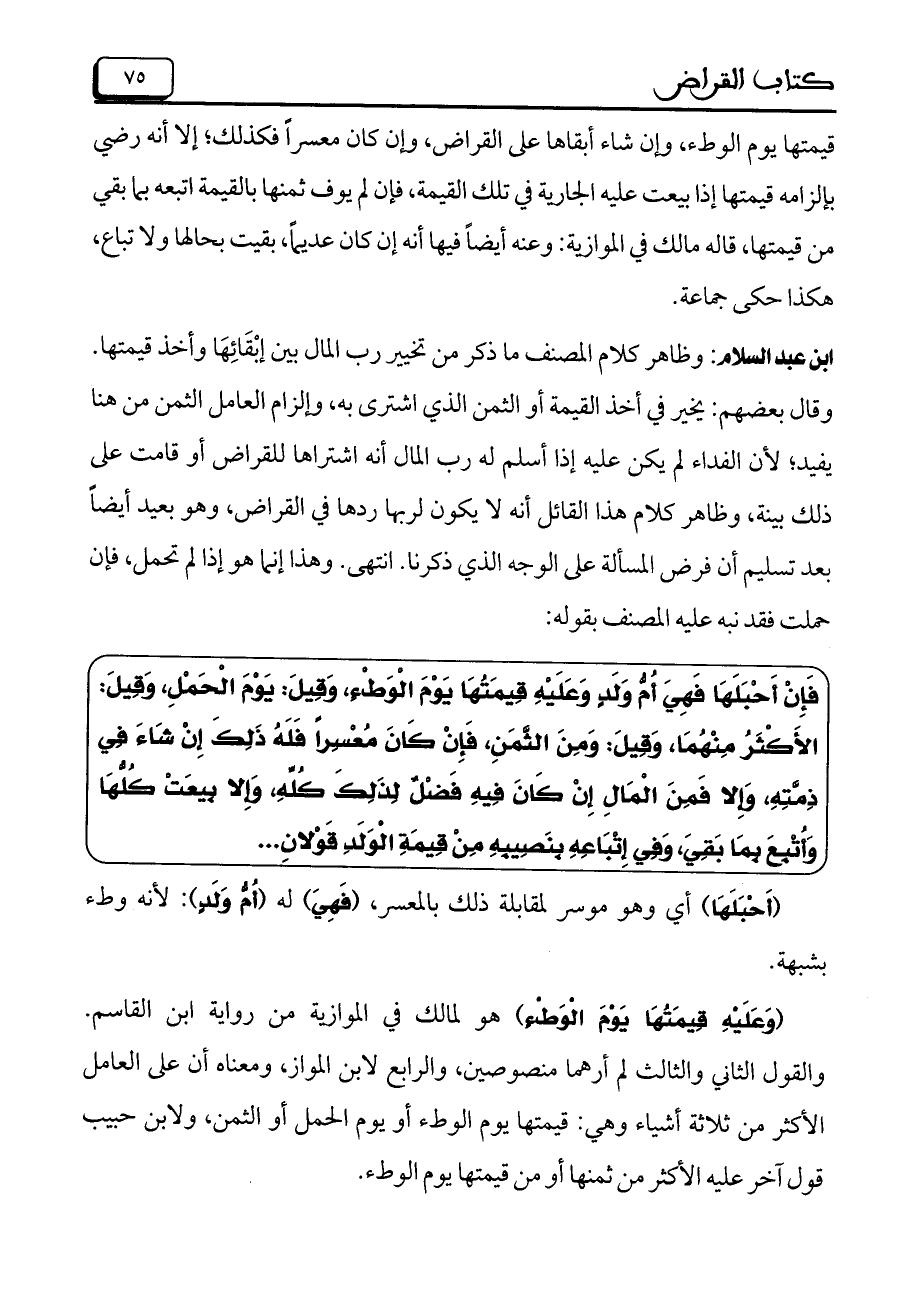 ابن عبد السلام: وظاهر كلام المصنف ما ذكر من تخيير رب المال بين إبقائها وأخذ قيمتها. وقال بعضهم: يخير في أخذ القيمة أو الثمن الذي اشترى به، وإلزام العامل الثمن من هنا يفيد؛ لأن الفداء لم يكن عليه إذا أسلم له رب المال أنه اشتراها للقراض أو قامت على ذلك بينة، وظاهر كلام هذا القائل أنه لا يكون لربها ردها في القراض، وهو بعيد أيضاً بعد تسليم أن فرض المسألة على الوجه الذي ذكرنا. انتهى. وهذا إنما هو إذا لم تحمل، فإن حملت فقد نبه عليه المصنف بقوله: