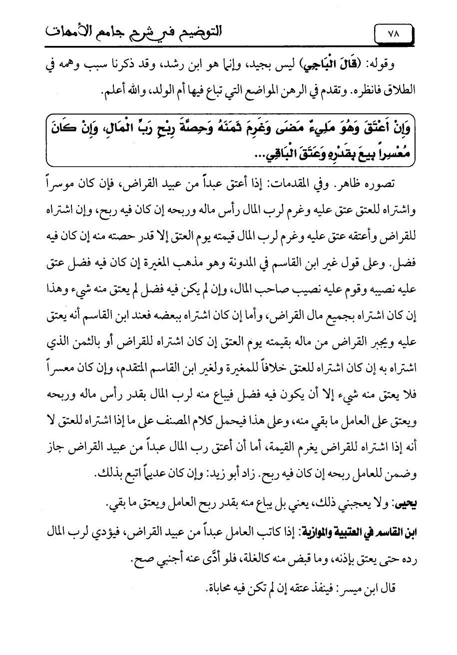 وقوله: (قَالَ الْبَاجِيُّ) ليس بجيد، وإنما هو ابن رشد، وقد ذكرنا سبب وهمه في الطلاق فانظره. وتقدم في الرهن المواضع التي تباع فيها أم الولد، والله أعلم.
