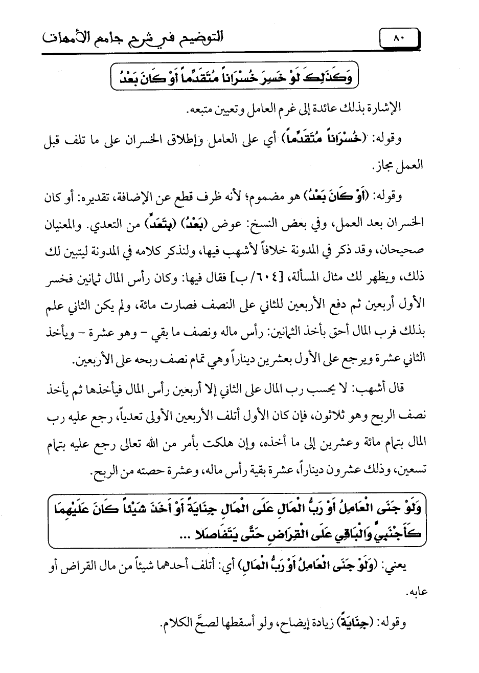 وقوله: (أَوْ كَانَ بَعْدُ) هو مضموم؛ لأنه ظرف قطع عن الإضافة، تقديره: أو كان الخسران بعد العمل، وفي بعض النسخ: عوض (بَعْدُ) (بتَعَدِّ) من التعدي. والمعنيان صحيحان، وقد ذكر في المدونة خلافاً لأشهب فيها، ولنذكر كلامه في المدونة ليتبين لك ذلك، ويظهر لك مثال المسألة، [604/ ب] فقال فيها: وكان رأس المال ثمانين فخسر الأول أربعين ثم دفع الأربعين للثاني على النصف فصارت مائة، ولم يكن الثاني علم بذلك فرب المال أحق بأخذ الثمانين: رأس ماله ونصف ما بقي- وهو عشرة- ويأخذ الثاني عشرة ويرجع على الأول بعشرين ديناراً وهي تمام نصف ربحه على الأربعين.
