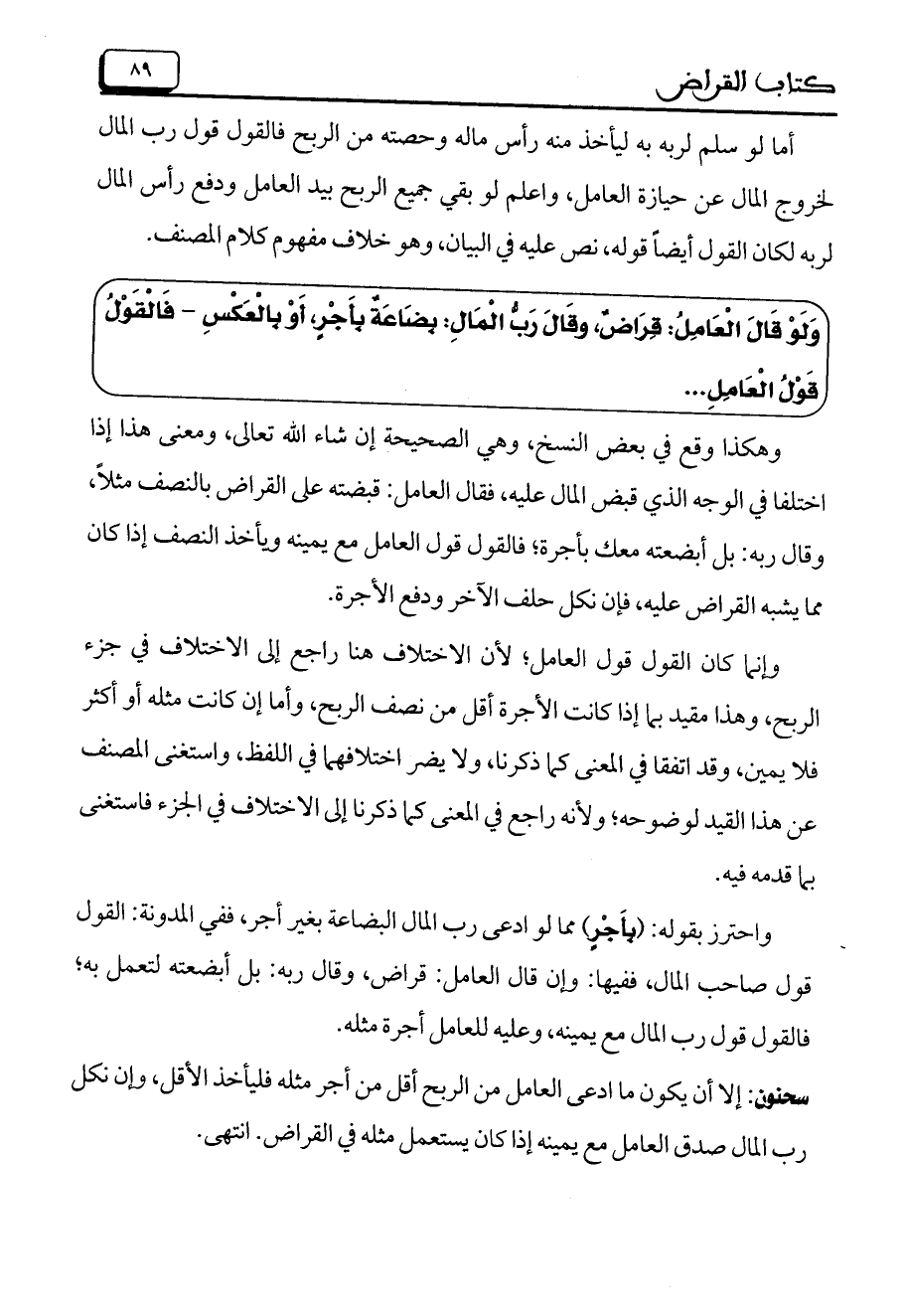 وهكذا وقع في بعض النسخ، وهي الصحيحة إن شاء الله تعالى، ومعنى هذا إذا اختلفا في الوجه الذي قبض المال عليه، فقال العامل: قبضته على القراض بالنصف مثلاً، وقال ربه: بل أبضعته معك بأجرة؛ فالقول قول العامل مع يمينه ويأخذ النصف إذا كان مما يشبه القراض عليه، فإن نكل حلف الآخر ودفع الأجرة.