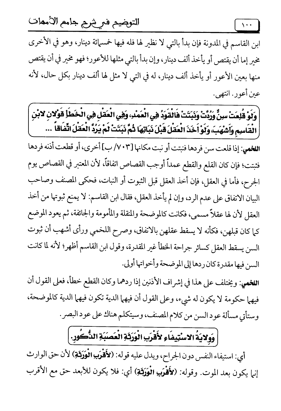 وَلَوْ قُلِعَتْ سِنٍّ وَرُدَّتْ وَنَبَتَتْ فَالْقَوَدُ فِي الْعَمْدِ، وَفِي الْعَقْلِ فِي الْخَطَأِ قَوْلانِ لابْنِ الْقَاسِمِ وَأَشْهَبَ، وَلَوْ أَخَذَ الْعَقْلَ قَبْلَ نَبَاتِهَا ثُمَّ نَبَتَتْ لَمْ يَرُدَّ الْعَقْلَ اتِّفَاقاً ...