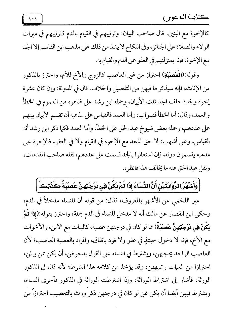 عبر اللخمي عن الأشهر بالمعروف، فقال: من قوله أن للنساء مدخلاً في الدم، وحكى ابن القصار عن مالك أنه لا مدخل للنساء في الدم جملة، واحترز بقوله: (إِذَا لَمْ يَكُنْ فِي دَرَجَتِهِنَّ عَصَبَةٌ) مما لو كان في درجتهن عصبة، كالبنات مع الابن، والأخوات مع الأخ، فإنه لا دخول حينئذٍ في عفو ولا قود باتفاق، والمراد بالعصبة العاصب؛ لأن العاصب الواحد يحجبهن، ويشترط في النساء على القول بدخولهن، أن يكن ممن يرثن، احترازاً من العمات وشبههن، وقد يؤخذ من كلامه هذا الشرط؛ لأنه قال في الذكور الورثة، فأشار إلى اشتراط الوراثة، وإذا اشترطت الوراثة في الذكور فأحرى النساء، ويشترط فيهن أيضاً أن يكن ممن لو كان في درجتهن ذكر ورث بالتعصيب احترازاً من