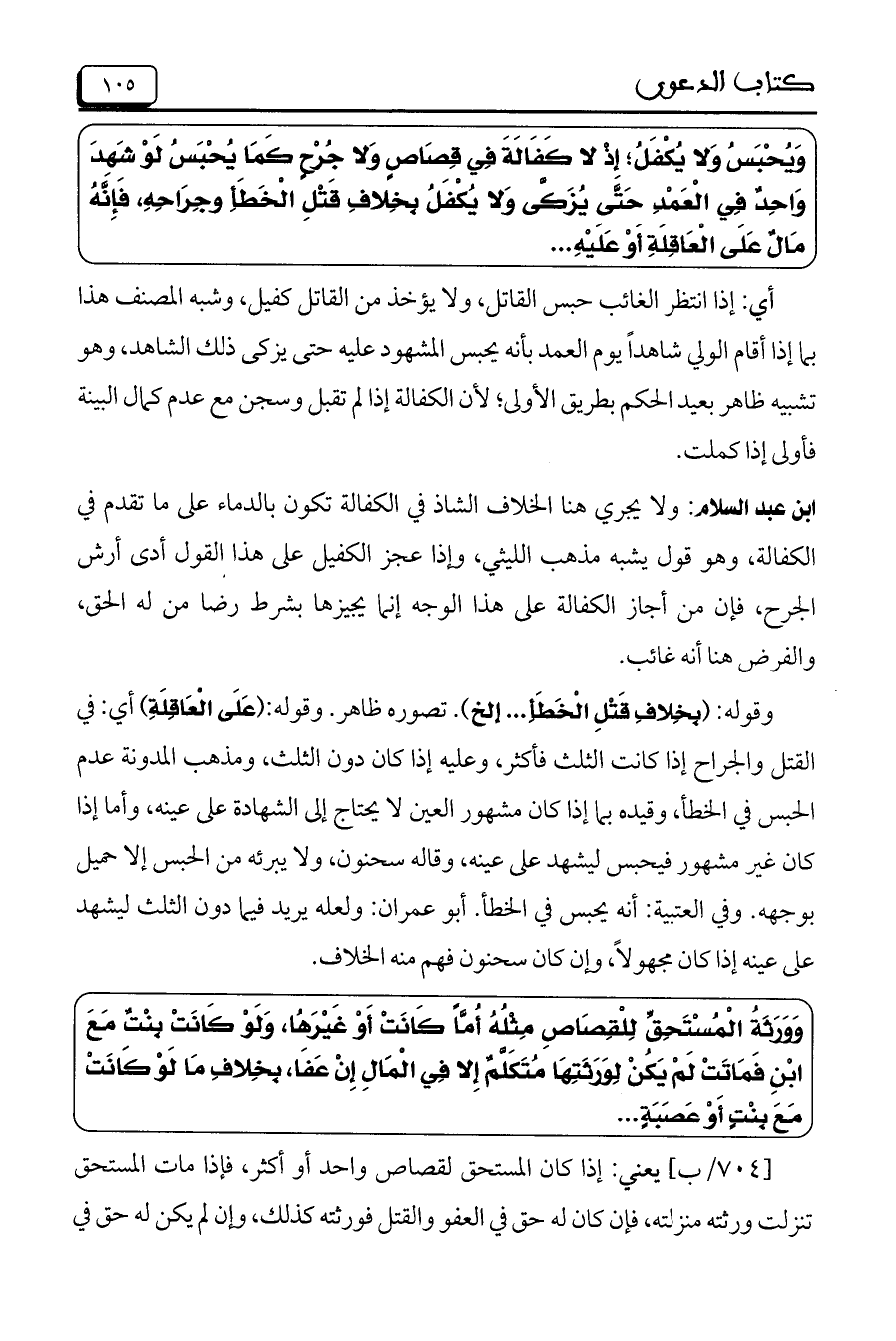 ابن عبد السلام: ولا يجري هنا الخلاف الشاذ في الكفالة تكون بالدماء على ما تقدم في الكفالة، وهو قول يشبه مذهب الليثي، وإذا عجز الكفيل على هذا القول أدى أرش الجرح، فإن من أجاز الكفالة على هذا الوجه إنما يجيزها بشرط رضا من له الحق، والفرض هنا أنه غائب.
