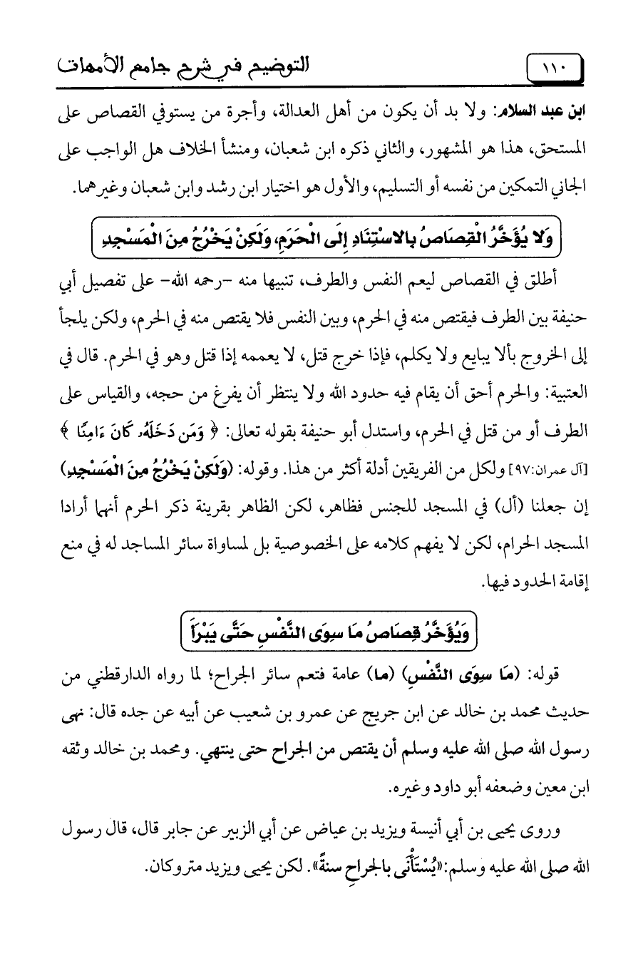 أطلق في القصاص ليعم النفس والطرف، تنبيهاً منه- رحمه الله- على تفصيل أبي حنيفة بين الطرف فيقتص منه في الحرم، وبين النفس فلا يقتص منه في الحرم، ولكن يلجأ إلى الخروج بألا يبايع ولا يكلم، فإذا خرج قتل، لا يعممه إذا قتل وهو في الحرم. قال في العتبية: والحرم أحق أن يقام فيه حدود الله ولا ينتظر أن يفرغ من حجه، والقياس على الطرف أو من قتل في الحرم، واستدل أبو حنيفة بقوله تعالى: (وَمَن دَخَلَهُ كَانَءَامِناً) [آل عمران: 97] ولكل من الفريقين أدلة أكثر من هذا. وقوله: (وَلَكِنْ يَخْرُجُ مِنَ الْمَسْجِدِ) إن جعلنا (أل) في المسجد للجنس فظاهر، لكن الظاهر بقرينة ذكر الحرم أنهما أرادا المسجد الحرام، لكن لا يفهم كلامه على الخصوصية بل لمساواة سائر المساجد له في منع إقامة الحدود فيها.