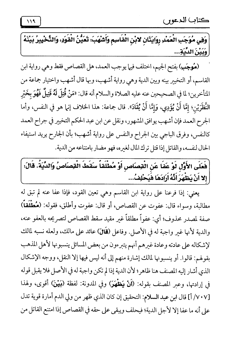 يعني: إذا فرعنا على رواية ابن القاسم وهي تعين القود، فإذا عفا عنه لم تبق له مطالبة، وسواء قال: عفوت عن القصاص، أو قال: عفوت وأطلق، فقوله: (مُطلَقاً) صفة لمصدر محذوف؛ أي: عفواً مطلقاً غير مقيد سقط القصاص لتصريحه بالعفو عنه، والدية لأنها غير واجبة له في الأصل. وفاعل (قَالَ) عائد على مالك، ولعله نسبه لمالك لإشكاله على عادته وعادة غيرهم أنهم يتبرءون من بعض المسائل ينسبونها لأهل المذهب بقولهم: قالوا. أو ينسبونها لمالك إشارة منهم إلى أنه ليس فيها إلا النقل، ووجه الإشكال الذي أشار إليه المصنف هنا ظاهر؛ لأن الدية إذا لم تكن واجبة له في الأصل فلا يقبل قوله في إرادتها، وعبر المصنف بقوله: (أَنْ يَظْهَرَ) وفي المدونة: لفظة (بَيْنَ) أقوى، ولهذا [707/أ] قال ابن عبد السلام: التحقيق إن كان الذي ظهر من ولي الدم أمارة قوية تدل على انه ما عفا إلا لأجل الدية؛ فيحلف ويبقى على حقه في القصاص إذا امتنع القاتل من