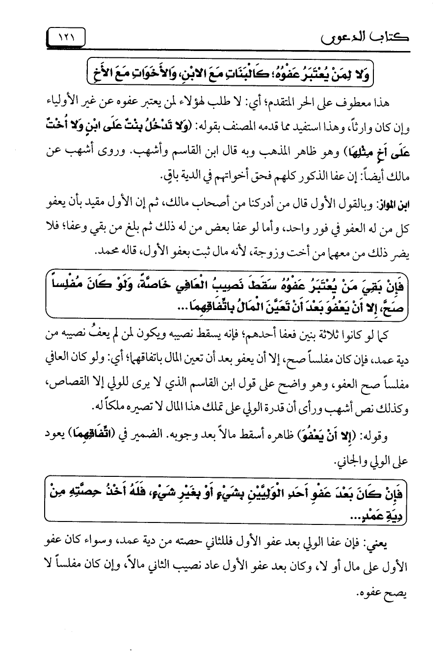 ابن المواز: وبالقول الأول قال من أدركنا من أصحاب مالك، ثم إن الأول مقيد بأن يعفو كل من له العفو في فور واحد، وأما لو عفا بعض من له ذلك ثم بلغ من بقي وعفا؛ فلا يضر ذلك من معهما من أخت وزوجة، لأنه مال ثبت بعفو الأول، قاله محمد.