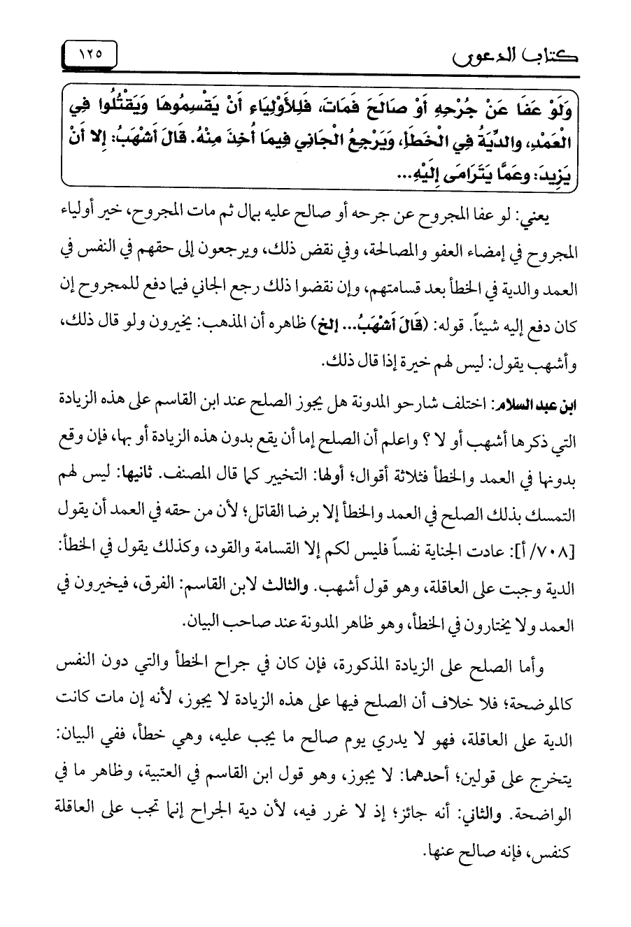 ابن عبد السلام: اختلف شارحو المدونة هل يجوز الصلح عند ابن القاسم على هذه الزيادة التي ذكرها أشهب أولا؟ واعلم أن الصلح إما أن يقع بدون هذه الزيادة أو بها، فإن وقع بدونها في العمد والخطأ فثلاثة أقوال: أولها: التخيير كما قال المصنف. ثانيها: ليس لهم التمسك بذلك الصلح في العمد والخطأ إلا برضا القاتل؛ لأن من حقه في العمد أن يقول [708/أ]: عادت الجناية نفساً فليس لكم إلا القسامة والقود، وكذلك يقول في الخطأ: الدية وجبت على العاقلة، وهو قول أشهب. والثالث لابن القاسم: الفرق، فيخيرون في العمد ولا يختارون في الخطأ، وهو ظاهر المدونة عند صاحب البيان.
