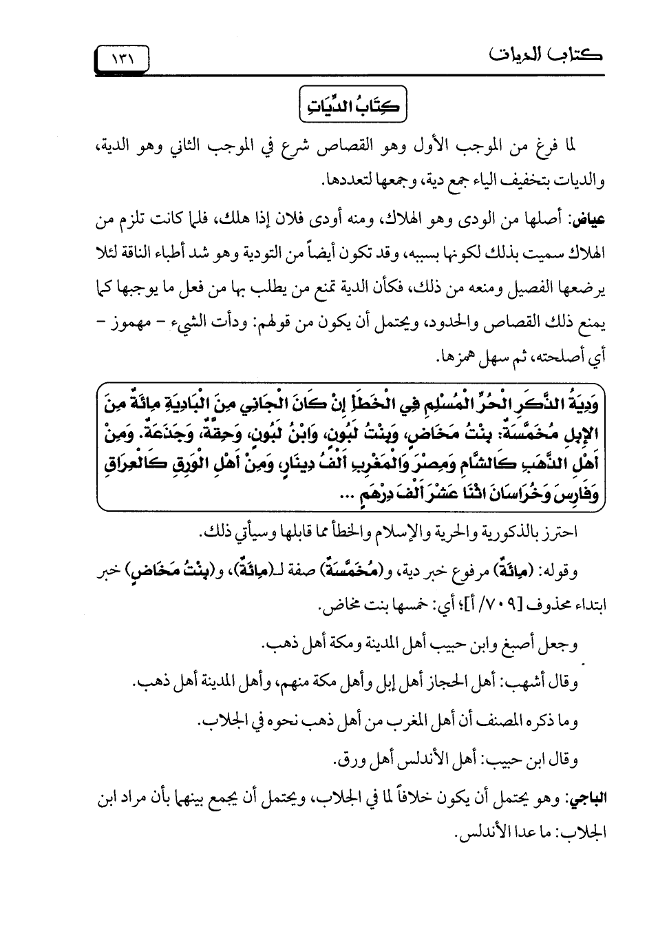 وَدِيَةُ الذِّكَرِ الْحُرِّ الْمُسْلِمِ فِي الْخَطَأِ إِنْ كَانَ الْجَانِي مِنَ الْبَادِيَةِ مِائَةٌ مِنَ الإِبلِ مُخَمَّسَةٌ: بِنْتُ مَخَاضٍ، وَبنْتُ لَبُونٍ، وَحِقَّةٌ، وَجَذَعَةٌ. وَمِنْ أَهْلِ الذَّهَبِ كَالشَّامِ وَمِصْرَ وَالْمَغْرِبِ أَلْفُ دِينَارٍ، وَمِنْ أَهْلِ الْوَرِقِ كَالْعِرَاقِ وَفَارِسَ وَخُرَاسَانَ اثْنَا عَشْرَ أَلْفَ دِرْهَمٍ ...