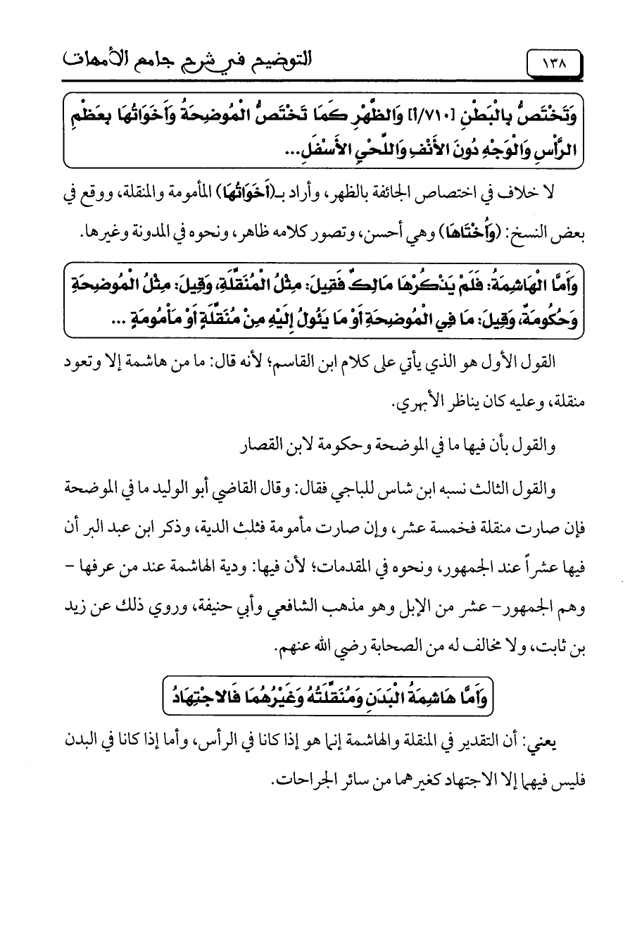 وَأَمَّا الْهَاشِمَةُ: فَلَمْ يَذْكُرْهَا مَالِكٌ فَقِيلَ: مِثْلُ الْمُنَقَّلَةِ، وَقِيلَ: مِثْلُ الْمُوضِحَةِ وَحُكُومَةٌ، وَقِيلَ: مَا فِي الْمُوضِحَةِ أَوْ مَا يَئُولُ إِلَيْهِ مِنْ مُنَقَّلَةٍ أَوْ مَامُومَةٍ ...