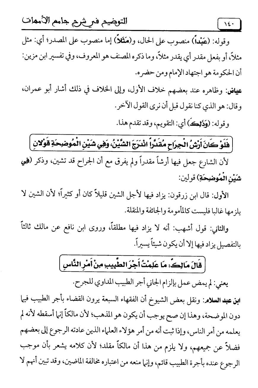 ابن عبد السلام: ونقل بعض الشيوخ أن الفقهاء السبعة يرون القضاء بأجر الطبيب فيما دون الموضحة، وهذا إن صح يوجب أن يكون هو المذهب؛ لأن مالكاً إنما أسقطه لأنه لم يعلمه من أمر الناس، وإذا ثبت أنه من أمر هؤلاء العلماء الذين عادته الرجوع إلى بعضهم فضلاً عن جميعهم، ولا يلزم من هذا أن مالكاً مقلد؛ لأن كلامه يشعر بأن موجب الرجوع عنده بأجرة الطبيب قائم، وإنما منعه من اعتباره مخالفة الماضين، وقد تبين أنهم لا