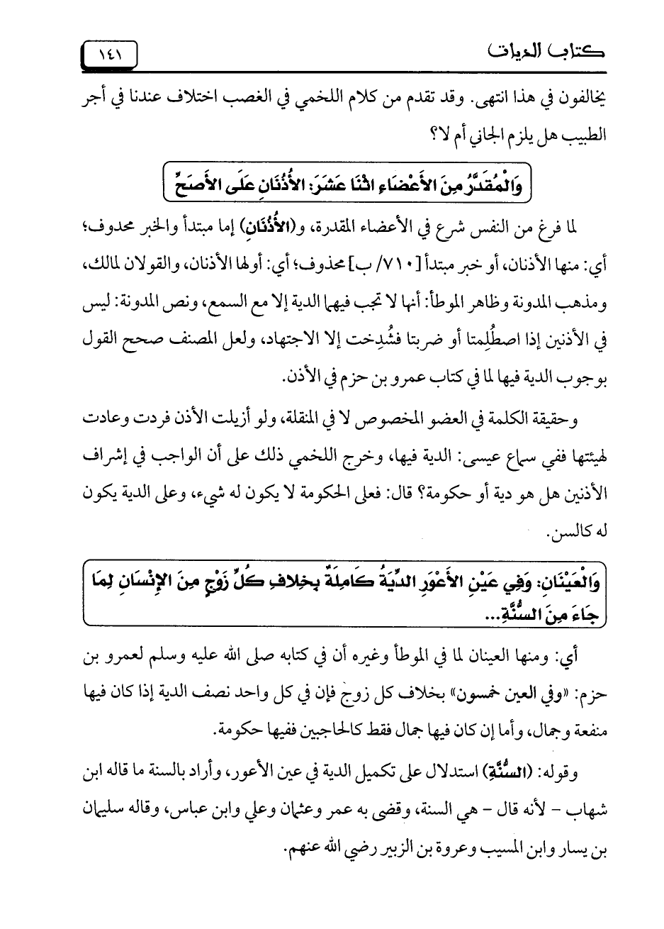 لما فرغ من النفس شرع في الأعضاء المقدرة، و (الأُذْنَانِ) إما مبتدأ والخبر محذوف؛ أي: منها الأذنان، أو خبر مبتدأ [710/ب] محذوف؛ أي: أولها الأذنان، والقولان لمالك، ومذهب المدونة وظاهر الموطأ: أنها لا تجب فيهما الدية إلا مع السمع، ونص المدونة: ليس في الأذنين إذا اصطُلِمتا أو ضربتا فشُدِخت إلا الاجتهاد، ولعل المصنف صحح القول بوجوب الدية فيها لما في كتاب عمرو بن حزم في الأذن.