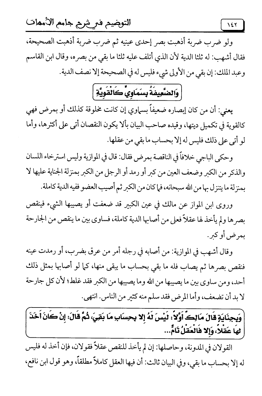 وروى ابن المواز عن مالك في عين الكبير قد ضعفت أو يصيبها الشيء فينقص بصرها ولم يأخذ لها عقلاً فعلى من أصابها الدية كاملة، فساوى بين ما ينقص من الجارحة بمرض أو كبر.