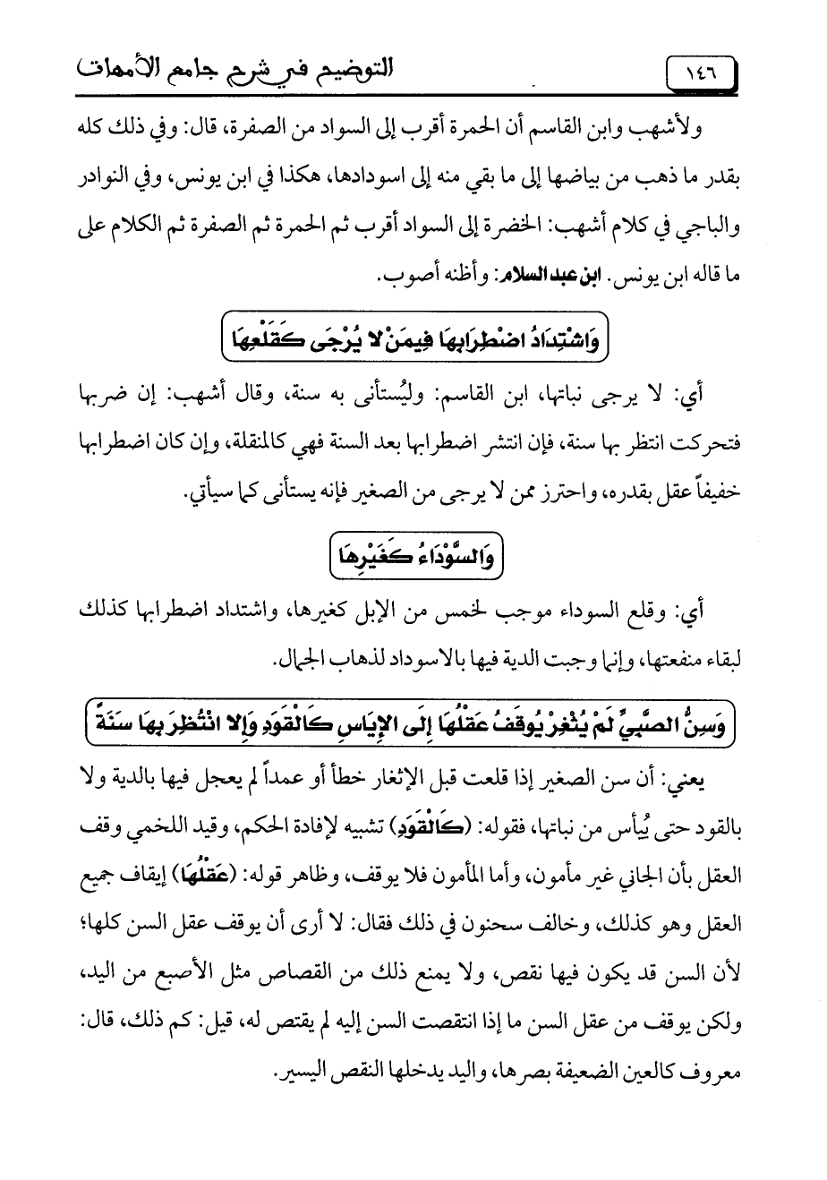 ولأشهب وابن القاسم أن الحمرة أقرب إلى السواد من الصفرة، قال: وفي ذلك كله بقدر ما ذهب من بياضها إلى ما بقي منه إلى اسودادها، هكذا في ابن يونس، وفي النوادر والباجي في كلام أشهب: الخضرة إلى السواد أقرب ثم الحمرة ثم الصفرة ثم الكلام على ما قاله ابن يونس. ابن عبد السلام: وأظنه أصوب.
