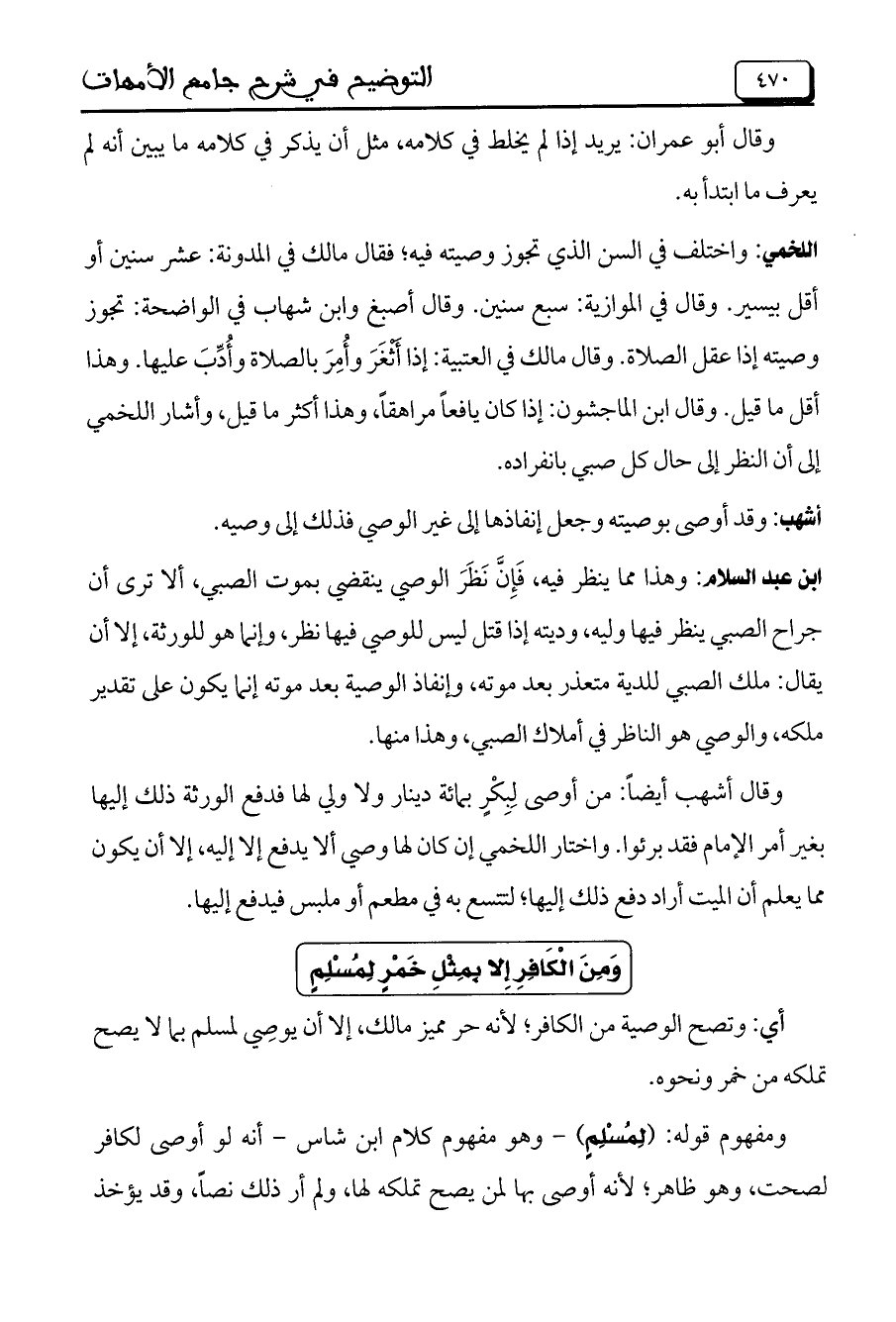 ابن عبد السلام: وهذا مما ينظر فيه، فَإِنَّ نَظَرَ الوصي ينقضي بموت الصبي، ألاترى أن جراح الصبي ينظر فيها وليه، وديته إذا قتل ليس للوصي فيها نظر، وإنما هو للورثة، إلا أن يقال: ملك الصبي للدية متعذر بعد وته، وإنفاذ الوصية بعد موته إنما يكون على تقدير ملكه، والوصي هو الناظر في أملاك الصبي، وهذا منها.