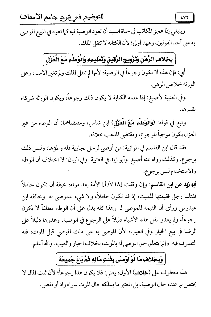 أبو زيد عن ابن القاسم: وإن وقفت [768/أ] الأمة بعد موته؛ خيفة أن تكونحاملاً فقتلها رجل فقيمتها للميت؛ إذ قد تكون حاملاً، ولا شيء للموصى له. وخالفه ابن عبدوس ورأى أن القيمة للموصى له وهذا كله يدل على أن الوطء مطلقاً لا يكون رجوعاً، ولم يعدوا نقل هذه الأشياء دليلاً على الرجوع في الوصية. وعدوها دليلاً على الرضا في بيع الخيار وفي العيب؛ لأن الموصى به على ملك الموصي قبل الموت؛ فله التصرف فيه. وإنما يتعلق حق الموصى له بالموت، بخلاف الخيار والعيب. والله أعلم.