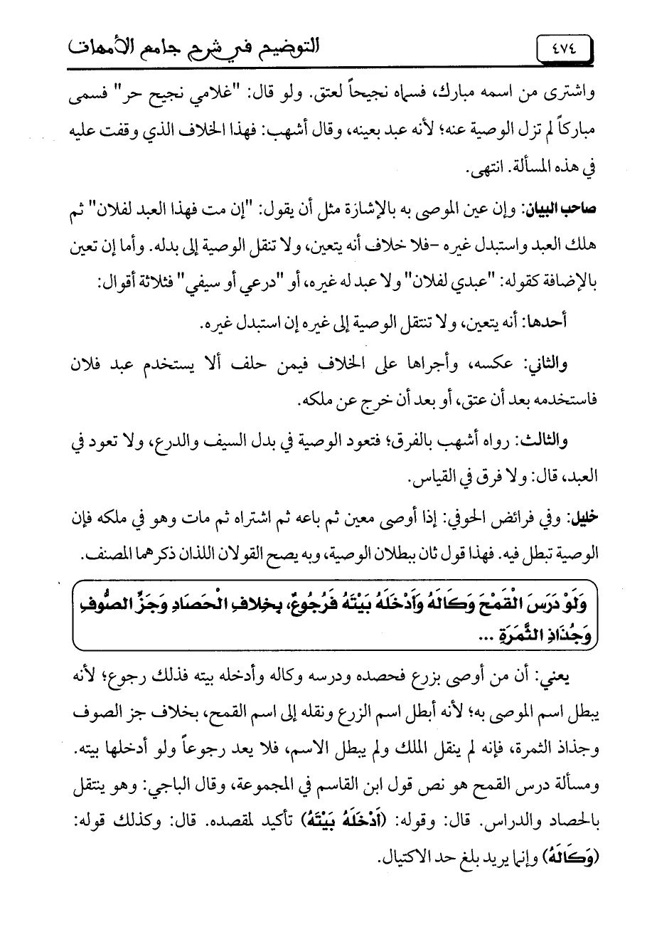 خليل: وفي فرائض الحوفي: إذا أوصى معين ثم باعه ثم اشتراه ثم مات وهو في ملكه فإن الوصية تبطل فيه. فهذا قول ثان ببطلان الوصية، وبه يصح القولان اللذان ذكرهما المصنف.