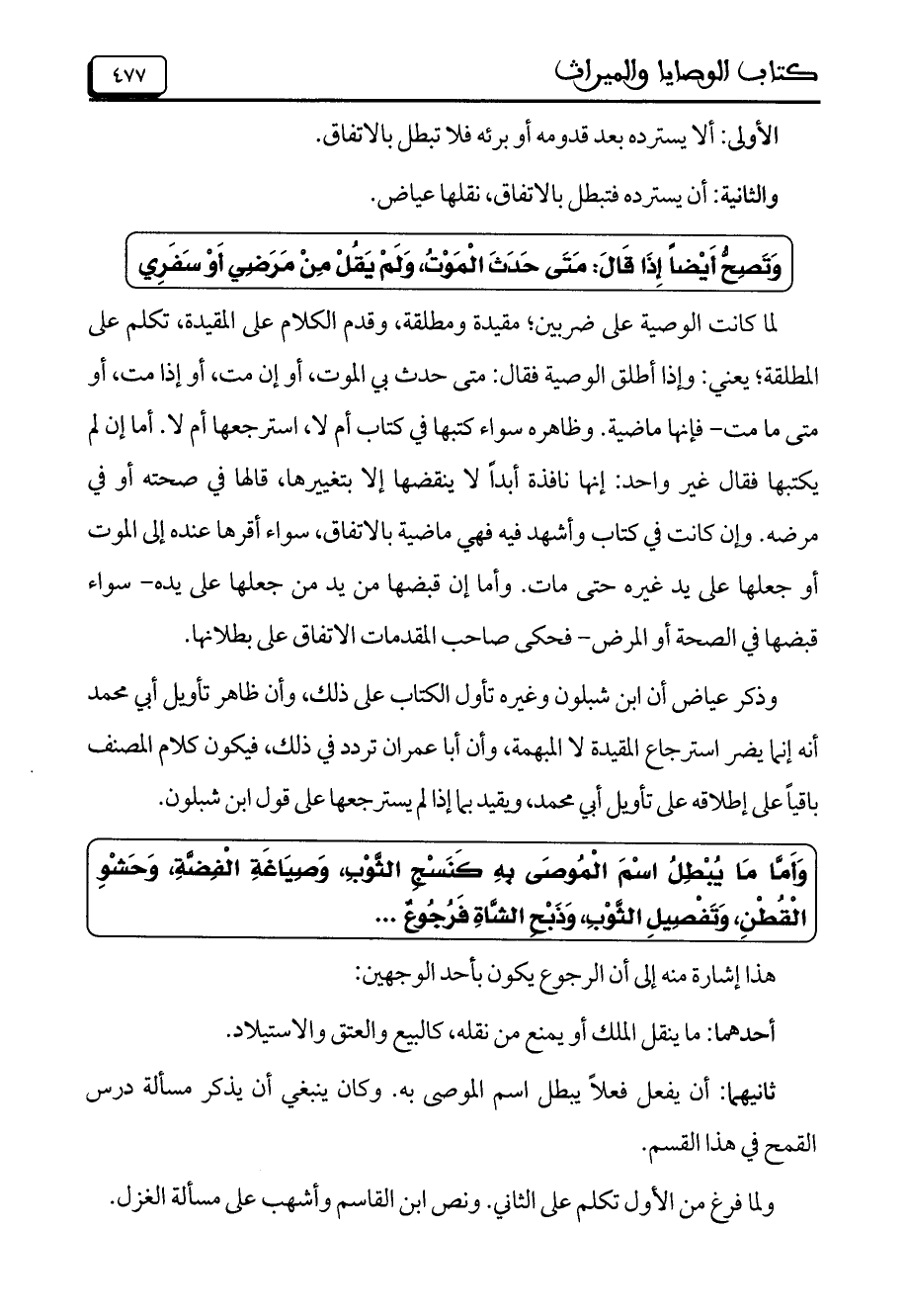 وَأَمَّا مَا يُبْطِلُ اسْمَ الْمُوصَى بهِ كَنَسْجِ الثَّوْبِ، وَصِيَاغَةِ الْفِضَّةِ، وَحَشْوِ الْقُطْنِ، وَتَفْصِيلِ الثَّوْبِ، وَذَبْحِ الشَّاةِ فَرُجُوعٌ ...