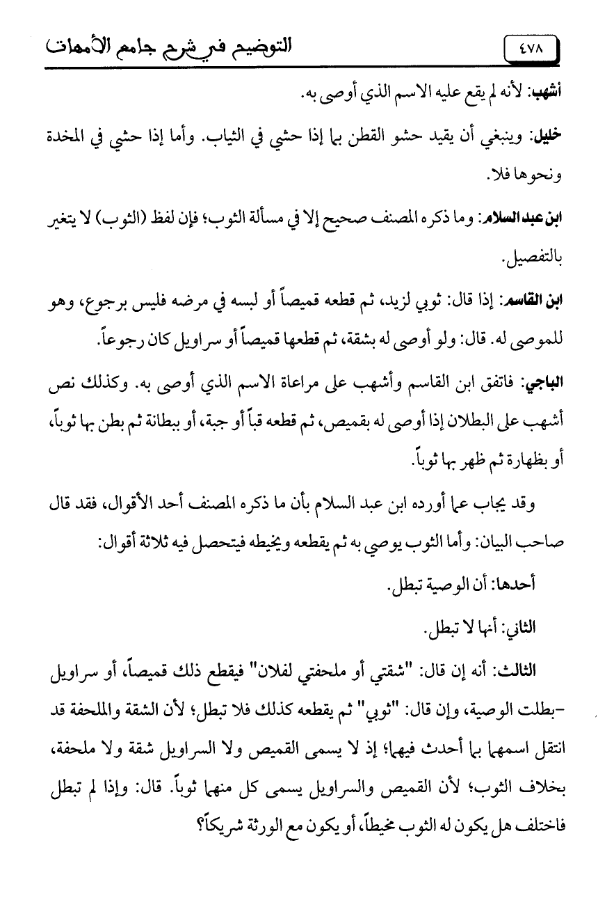 ابن عبد السلام: وما ذكره المصنف صحيح إلا في مسألة الثوب؛ فإن لفظ (الثوب) لا يتغير بالتفصيل.