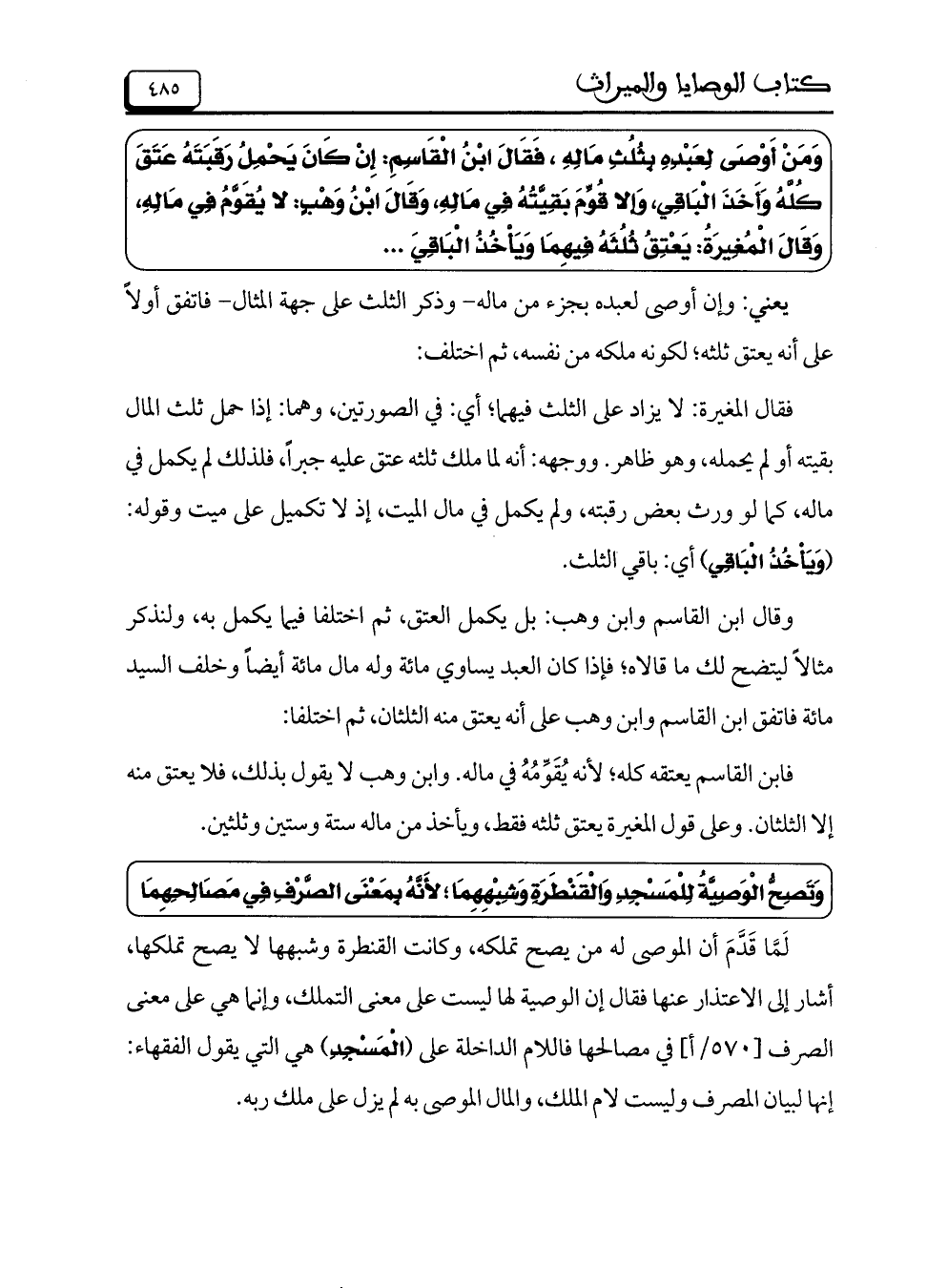 لَمَّا قَدَّمَ أن الموصى له من يصح تملكه، وكانت القنطرة وشبهها لا يصح تملكها، أشار إلى الاعتذار عنها فقال إن الوصية لها ليست على معنى التملك، وإنما هي على معنى الصرف [570/أ] في مصالحها فاللام الداخلة على (الْمَسْجِدِ) هي التي يقول الفقهاء: إنها لبيان المصرف وليست لام الملك، والمال الموصى به لم يزل على ملك ربه.
