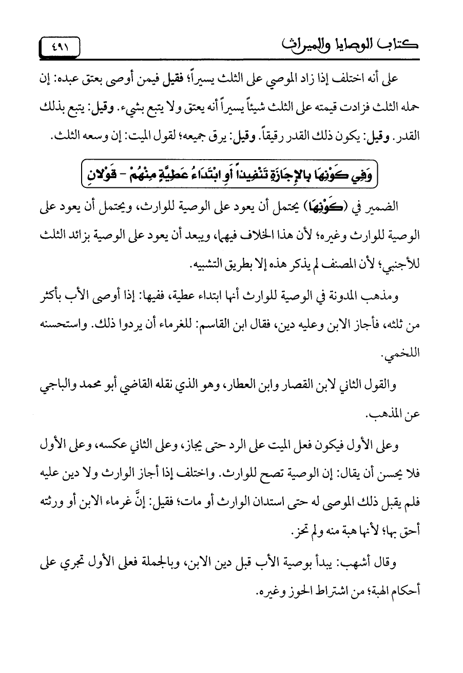 الضمير في (كَوْنِهَا) يحتمل أن يود على الوصية للوارث، ويحتمل أن يود على الوصية للوارث وغيره؛ لأن هذا الخلاف فيهما، ويبعد أن يعود على الوصية بزائد الثلث للأجنبي؛ لأن المصنف لم يذكر هذه إلا بطريق التشبيه.