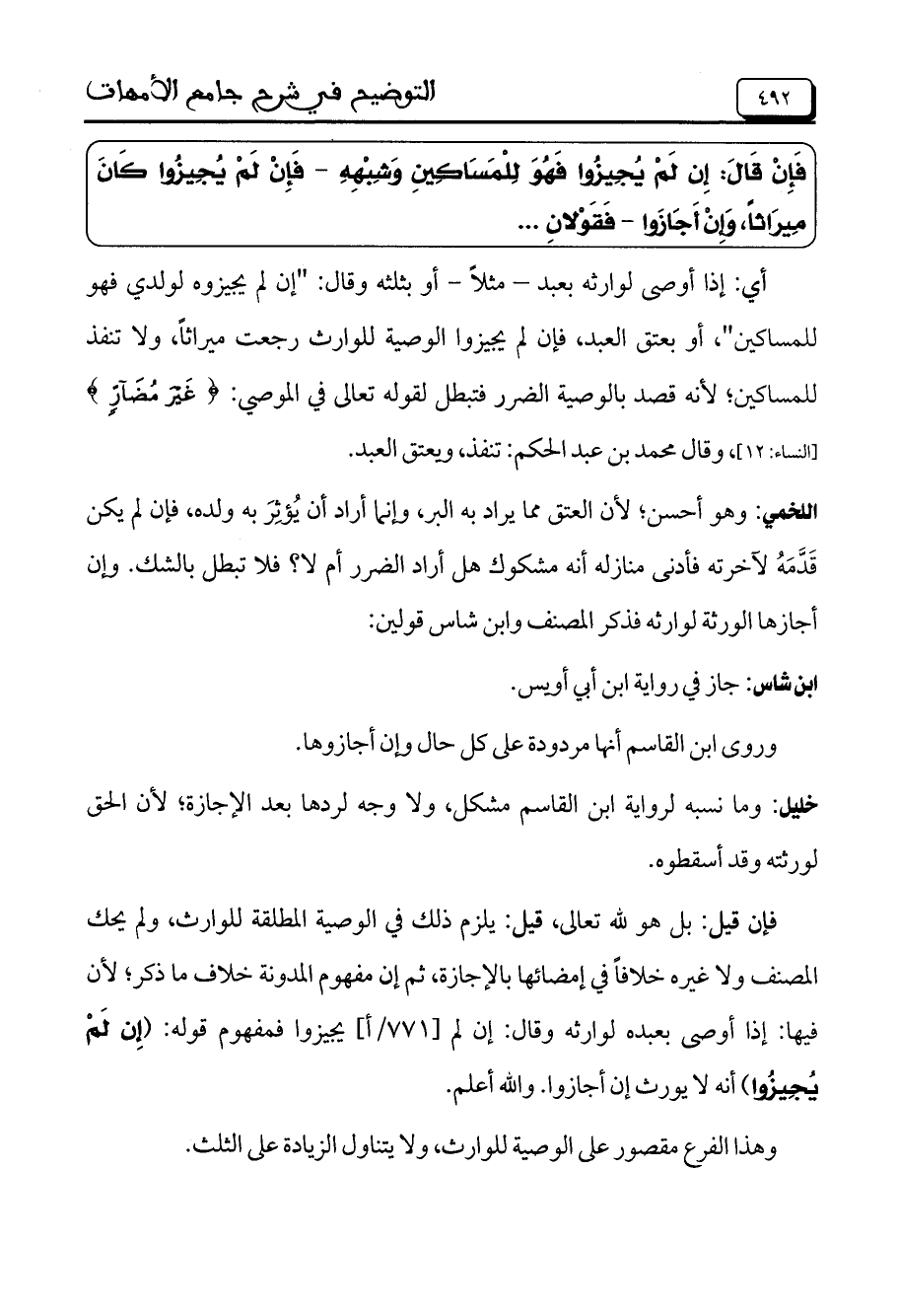 فإن قيل: بل هو لله تعالى، قيل: يلزم ذلك في الوصية المطلقة للوارث، ولم يحك المصنف ولا غيره خلافاً في إمضائها بالإجازة، ثم إن مفهوم المدونة خلاف ما ذكر؛ لأن فيها: إذا أوصى بعبده لوارثه وقال: إن لم [771/أ] يجيزوا فمفهوم قوله: (إِنْ لَمْ يُجِيزُوا) أنه لا يورث إن أجازوا. والله أعلم.