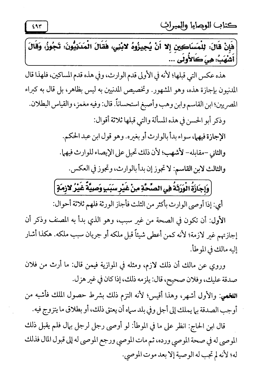 هذه عكس التي قبلها؛ لأنه في الأولى قدم الوارث، وفي هذه قدم المساكين، فلهذا قال المدنيون بإجازةهذه، وهو المشهور. وتخصيص المدنيين به ليس بظاهر، بل قال به كبراء المصريين؛ ابن القاسم وابن وهب وأصبغ استحساناً. قال: وفيه مغمز، والقياس البطلان.