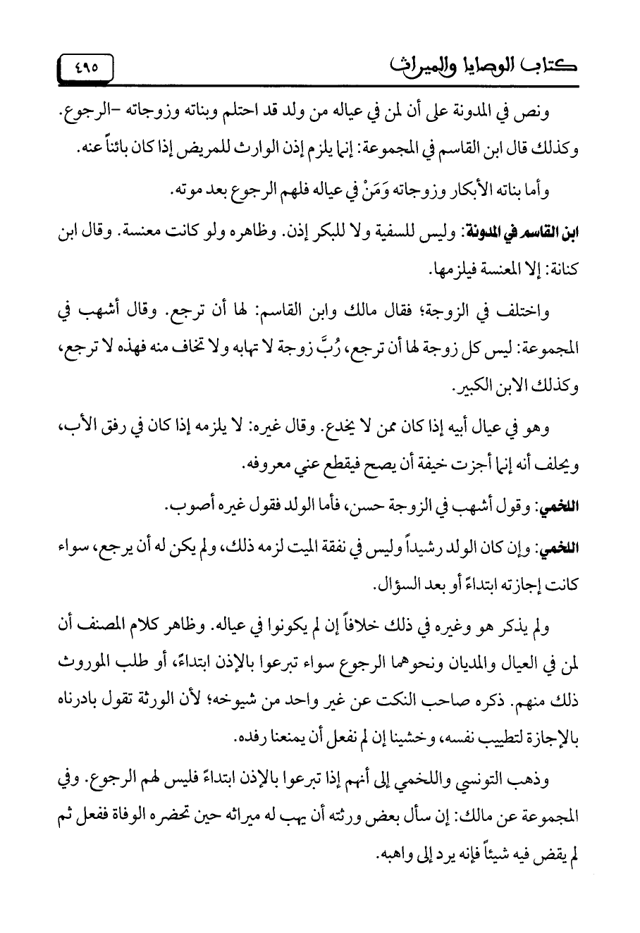 ونص في المدونة على أ، لمن في عياله من ولد قد احتلم وبناته وزوجاته- الرجوع. وكذلك قال ابن القاسم في المجموعة: إنما يلزم إّن الوارث للمريض إذا كان بائناً عنه. وأما بناته الأبكار وزوجاته وَمَنْ في عياله فلهم الرجوع بعد موته.