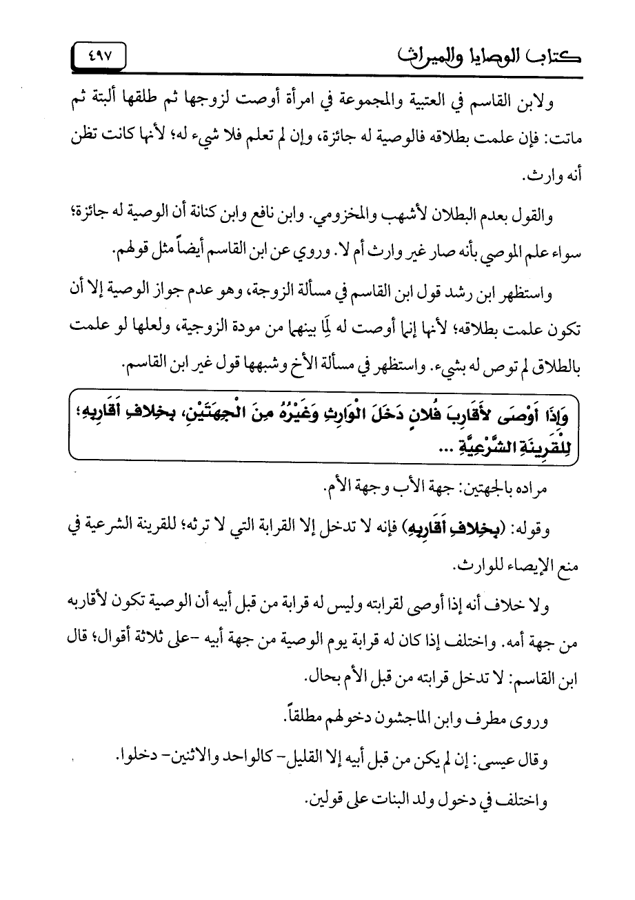 واستظهر ابن رشد قول ابن القاسم في مسألة الزوجة، وهودم جواز الوصية إلا أن تكون علمت بطلاقه؛ لأنها إنما أوصت له لِمَا بينهما من مودة الزوجية، ولعلها لو علمت بالطلاق لم توص له بشيء. واستظهر في مسألة الأخ وشببها قول غير ابن القاسم.
