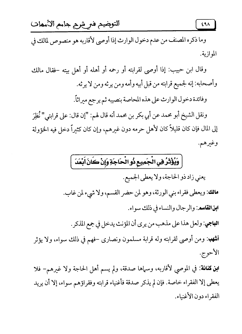 ابن كنانة: في الموصي لأقاربه، وسماها صدقة، ولم يسم أهل الحاجة ولا غيرهم- فلا يعطى إلا الفقراء خاصة. فإن لم يذكر صدقة فأغنياء قرابته وفقراؤهم سواء، إلا أن يريد الفقراء دون الأغنياء.