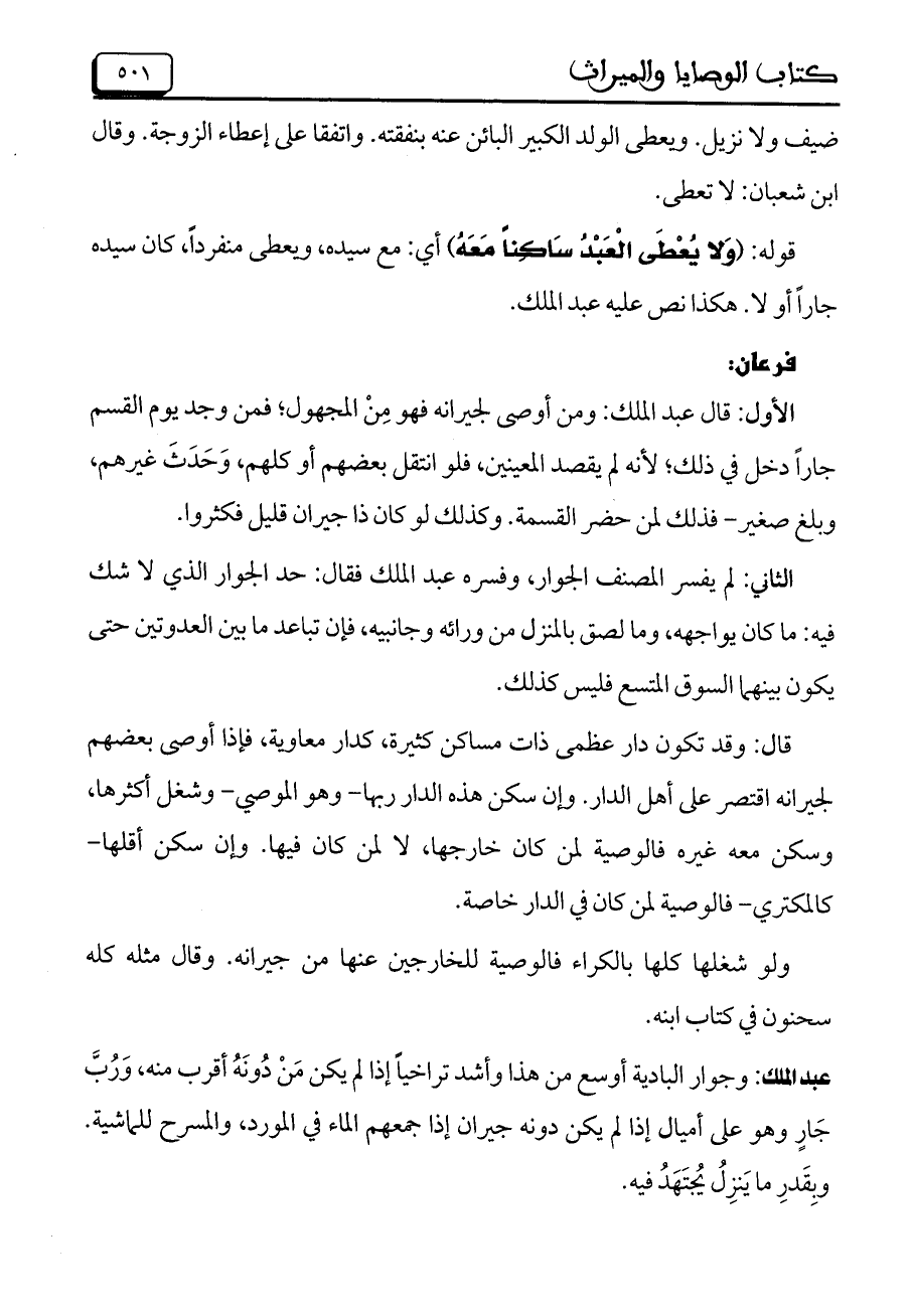 عبد الملك: وجوار البادية أوسع من هذا وأشد تراخياً إذا لم يكن مَنْ دُونَهُ أقرب منه، وَرُبَّ جَارٍ وهو على أميال إذا لم يكن دونه جيران إذا جمعهم الماء في المورد، والمسرح للماشية. وبِقَدرِ ما يَنزِلُ يُجتَهَدُ فيه.