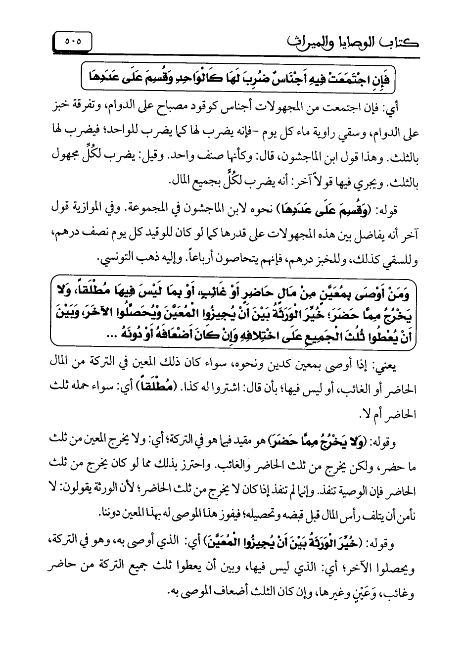 وَمَنْ أَوْصَى بمُعَيَّنٍ مِنْ مَالٍ حَاضِرٍ أَوْ غَائِبٍ، أَوْ بمَا لَيْسَ فِيهَا مُطْلَقاً، وَلا يَخْرُجُ مِمَّا حَضَرَ؛ خُيِّرَ الْوَرَثَةُ بَيْنَ أَنْ يَجِيزُوا الْمُعَيَّنَ وْيُحَصِّلُوا الآخَرَ، وَبَيْنَ أَنْ يُعْطُوا ثُلُثَ الْجَمِيعِ عَلَى اخْتِلافِهِ وَإِنْ كَانَ أضْعَافَهُ أَوْ دُونَهُ ...